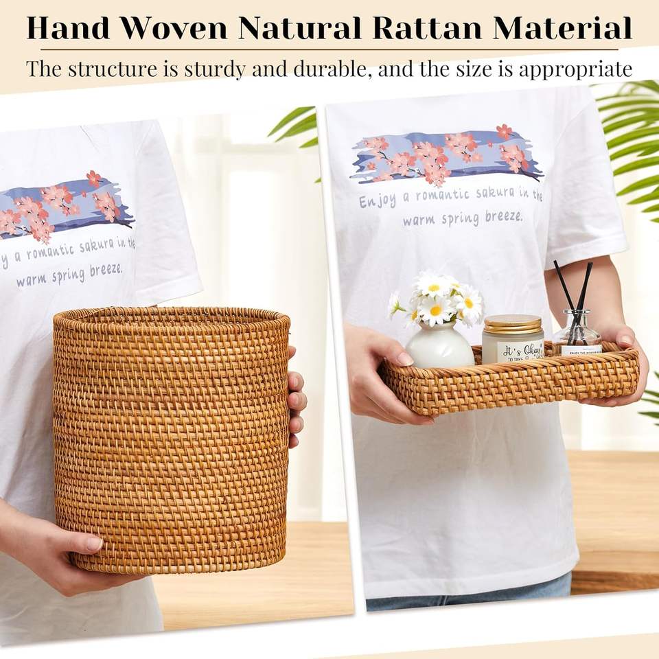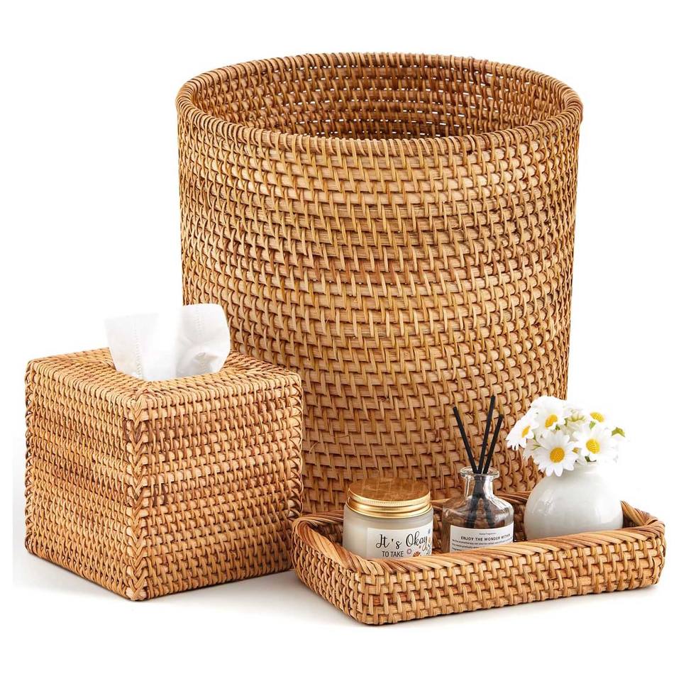 Juego de 3 Accesorios de Baño de Ratán, Decoración Tejida a Mano para el Hogar, Cesto para Papel, Caja de Pañuelos Cuadrada y Cesta de Almacenamiento
