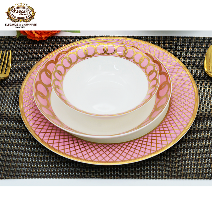 Juego de vajilla de porcelana china de hueso rosa de 3 piezas con borde dorado Diseño clásico Girlhood Dream Dishes para niñas