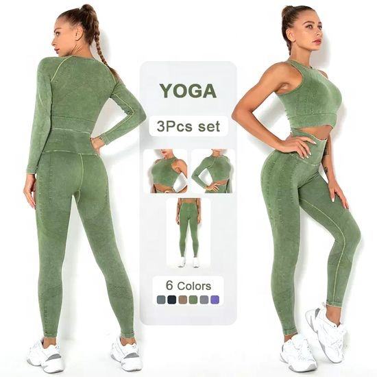 Conjunto de yoga de 3 piezas con leggings acanalados en forma de U, de cintura alta, hasta el tobillo, con efecto levanta glúteos, de spandex y nailon, con personalización.