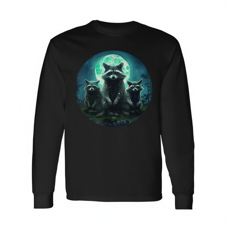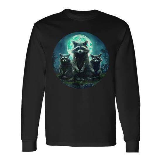 Camiseta de manga larga con diseño de 3 cabezas de mapache ladrando a la luna, producto promocional