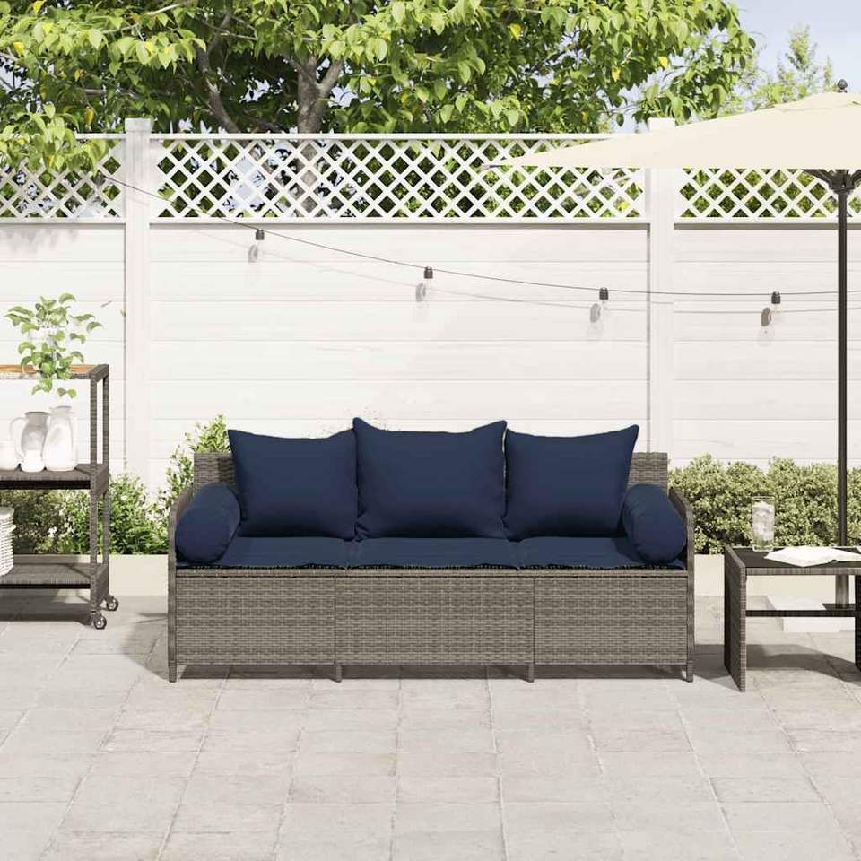 Sofá de patio de ratán sintético gris de 3 plazas con cojines, sofás de jardín