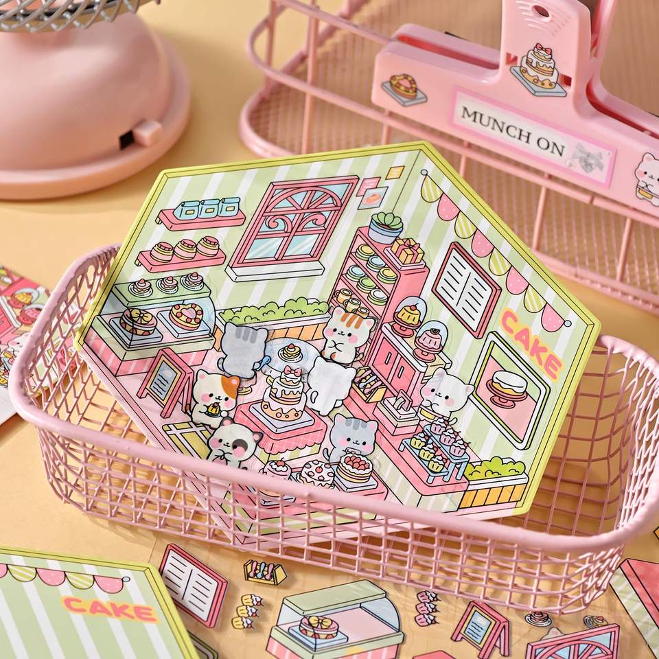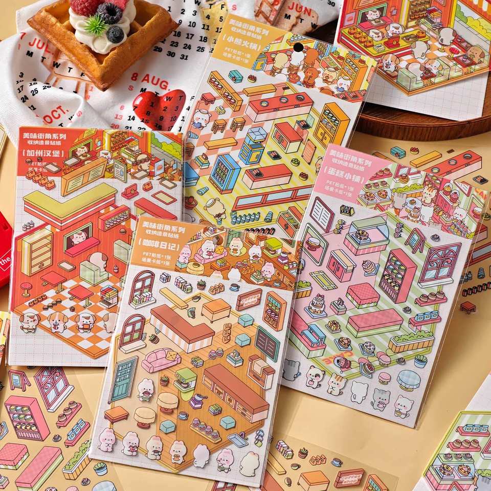 Paquete de 3 Hojas de Pegatinas Decorativas para Paisajismo, Serie Esquina de Calle Deliciosa, Pegatinas con Escenas de Casas Lindas