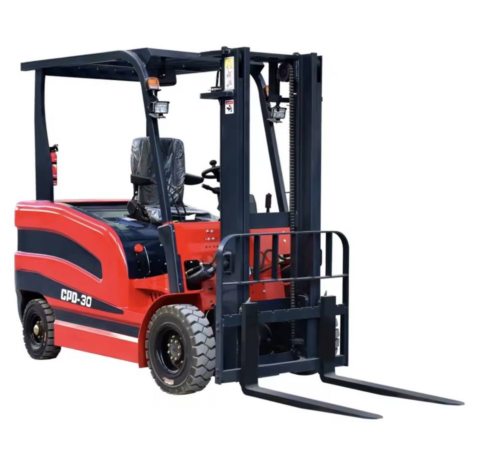Montacargas de 3 toneladas con mástil de 3 etapas, tracción total, batería de plomo-ácido, alcance de 6 metros, desplazador lateral hidráulico, neumáticos sólidos, con asiento.