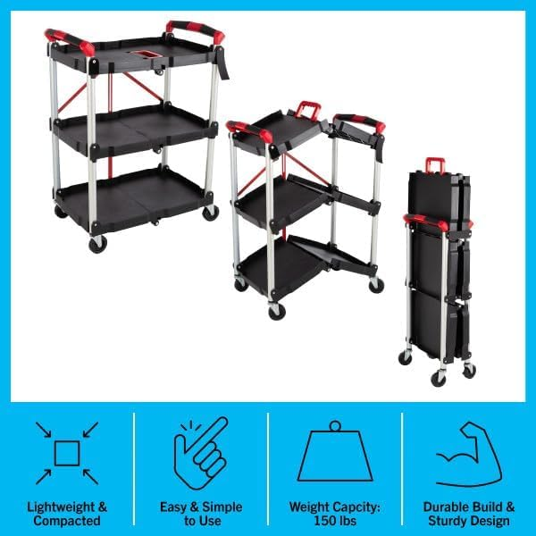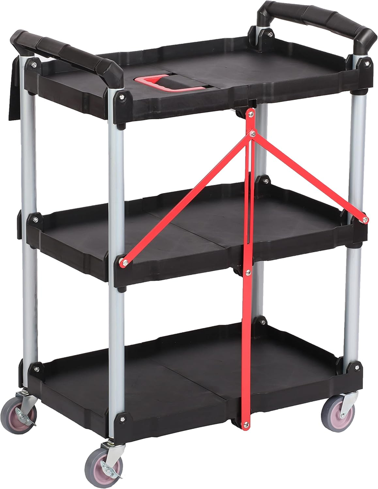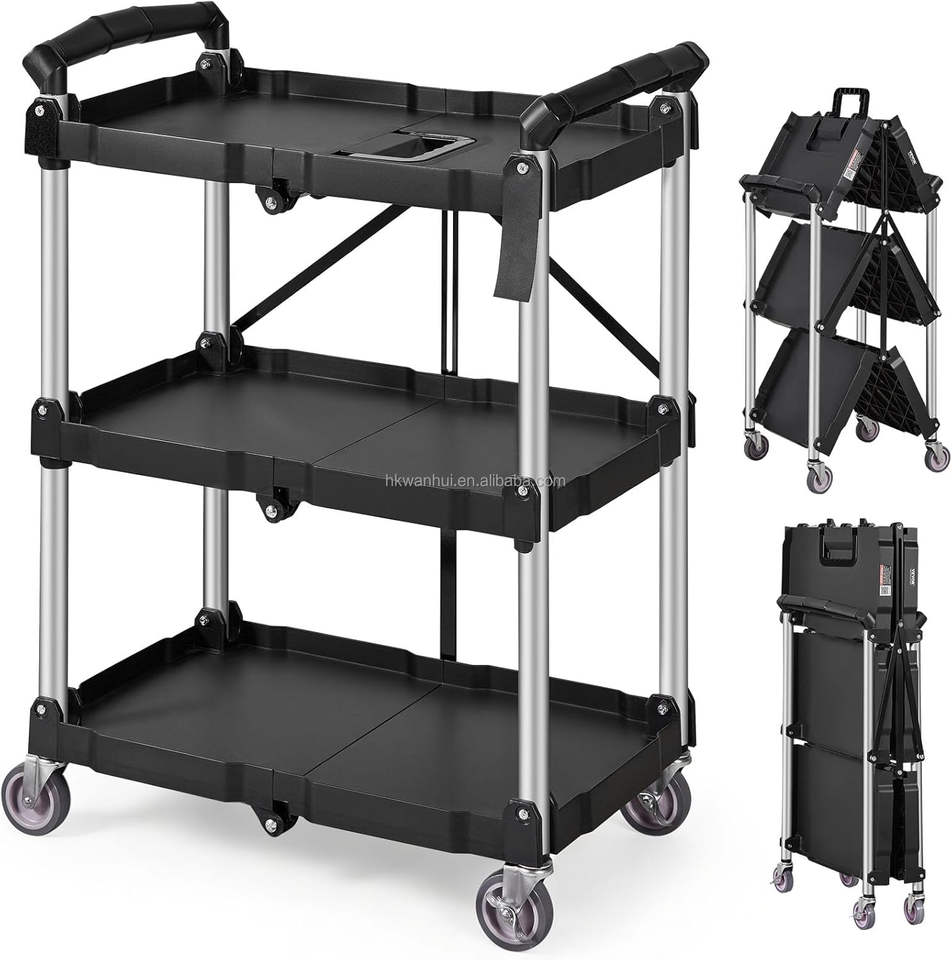 Carrito de Servicio Rodante de 3 Niveles con Ruedas para Almacenes, Hogares, Talleres, Garajes, Restaurantes, Carrito de Servicio Plegable Portátil