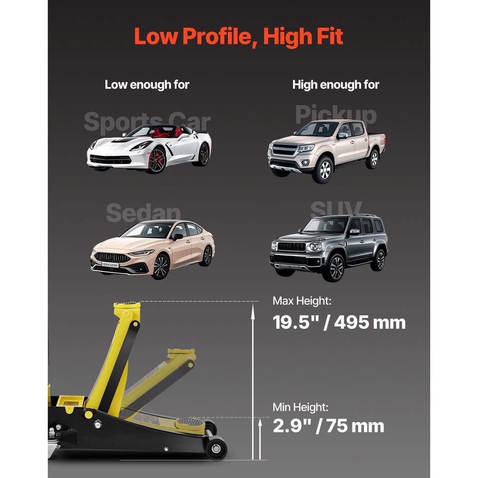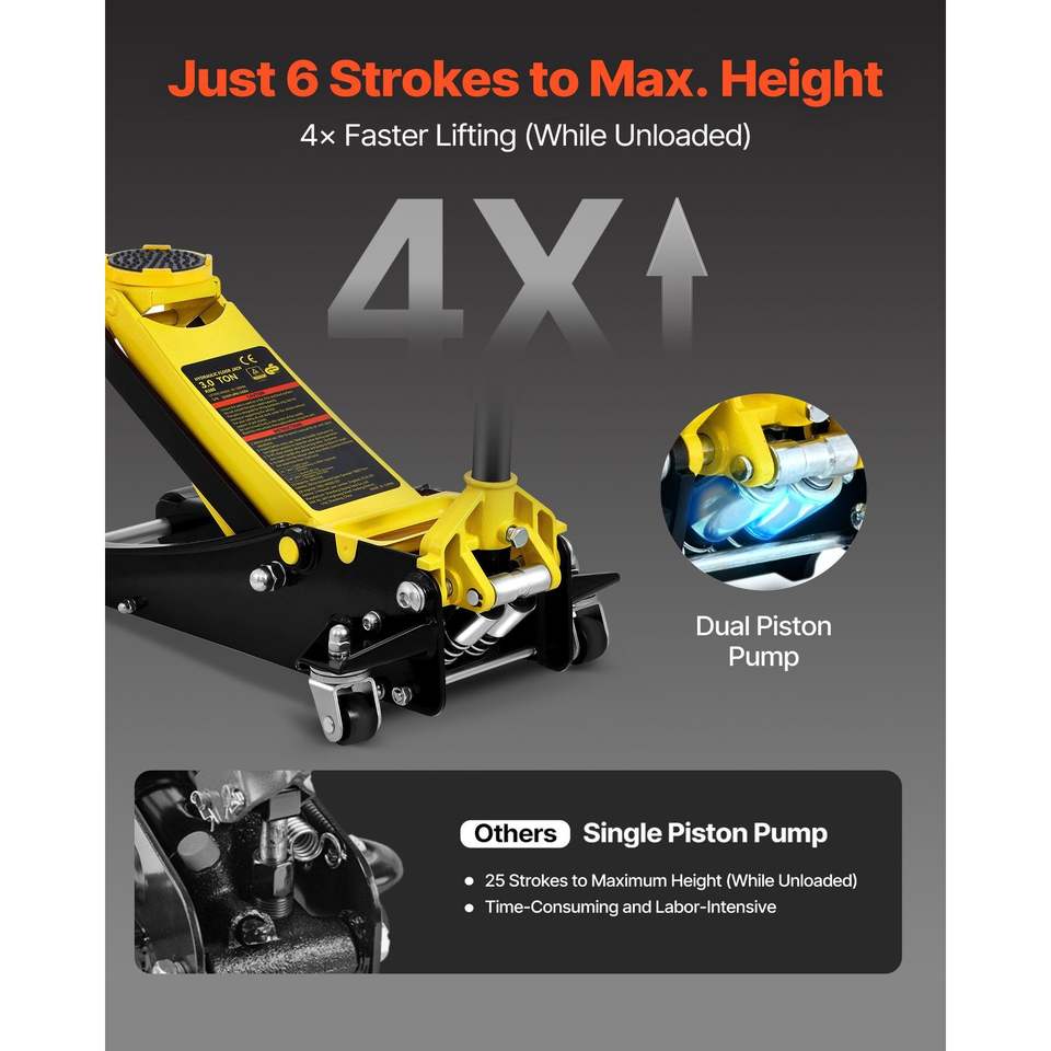 Gato hidráulico de suelo de acero de 3 toneladas de perfil bajo con doble pistón y elevación rápida para coches