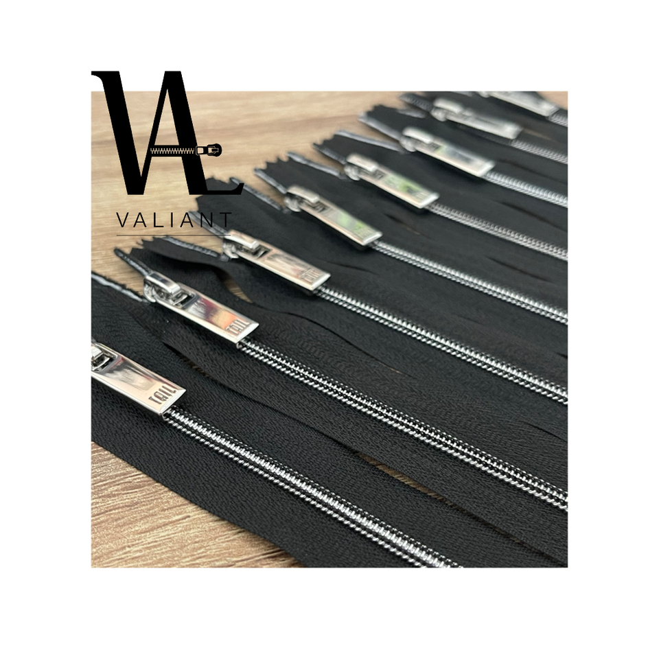 # Cremallera de poliéster metalizada al vacío con costuras de color en contraste, extremo cerrado, tirador plateado brillante de alto brillo, tamaño personalizado
