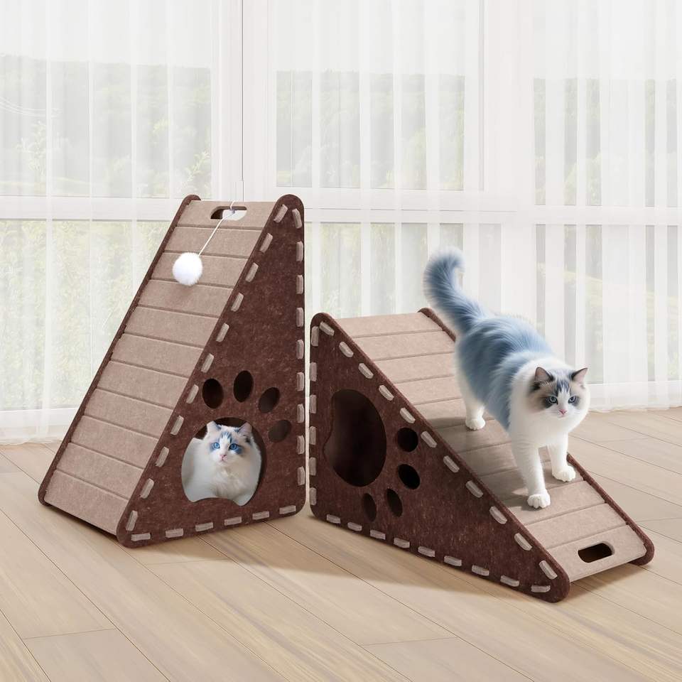 Estación para Gatos 3 en 1 - Rascador Triangular de Fieltro con Rampa Vertical, Centro de Entretenimiento para Varios Gatos (60x40x30cm) para Jugar y Descansar