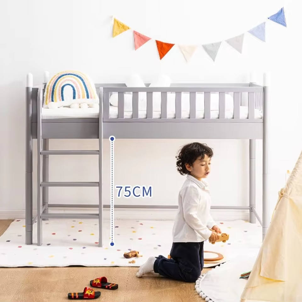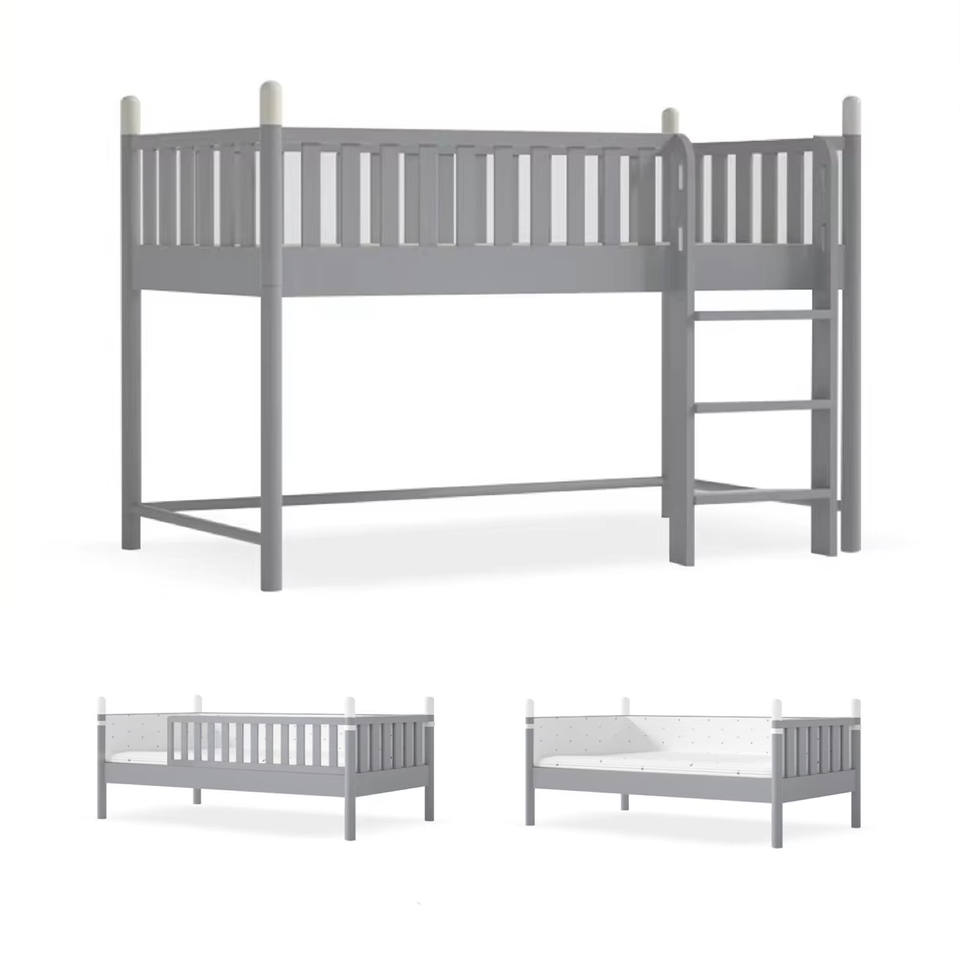 Cama Alta Convertible 3 en 1 de Madera Maciza Gris, Muebles para Dormitorio Infantil que Ahorran Espacio con Barandillas de Seguridad