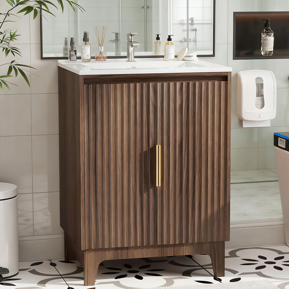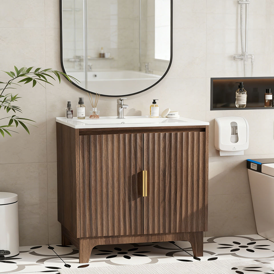 Mueble de Baño de 30 Pulgadas en Nogal Oscuro con Lavabo de Cerámica Integrado, Puertas Dobles Acanaladas, Mueble de Baño Independiente