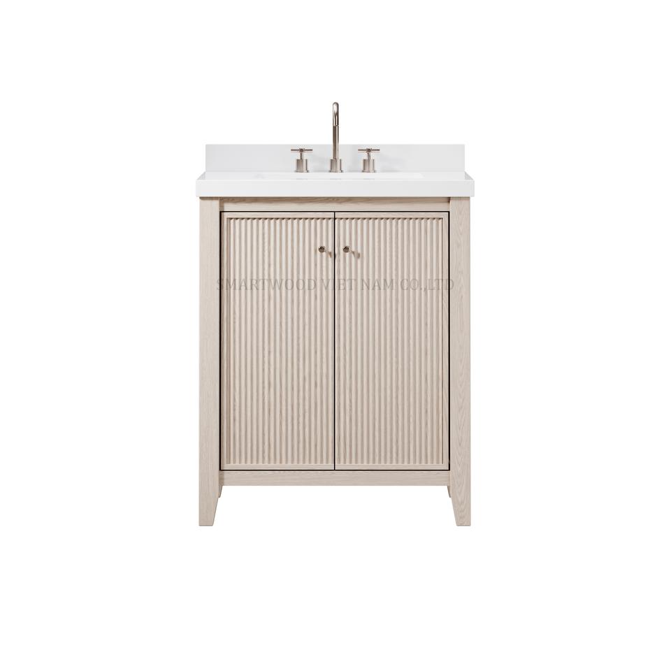 Tocador de baño de lavabo individual moderno de 30 pulgadas Gabinete de baño montado en la pared de madera contrachapada MDF de color roble personalizado
