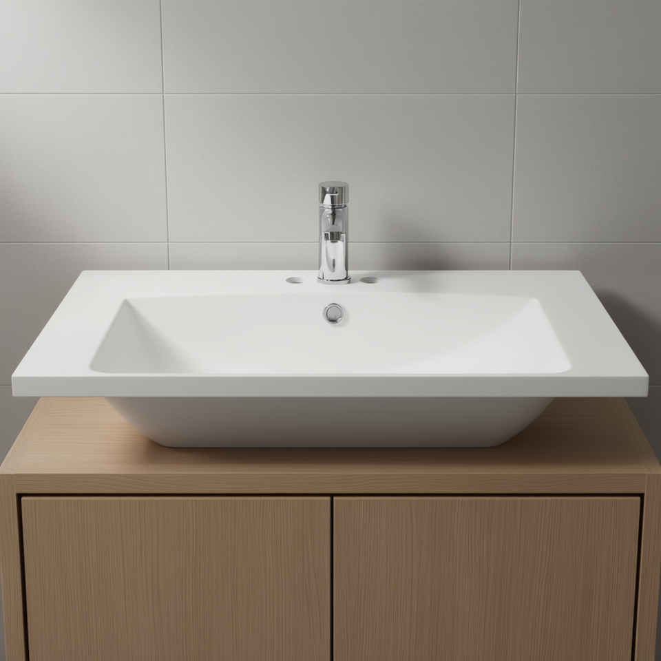 Encimera de Baño de Cerámica Blanca, Lavabo Rectangular de 30 Pulgadas, Montaje de Grifo de Tres Orificios, Diseño Contemporáneo