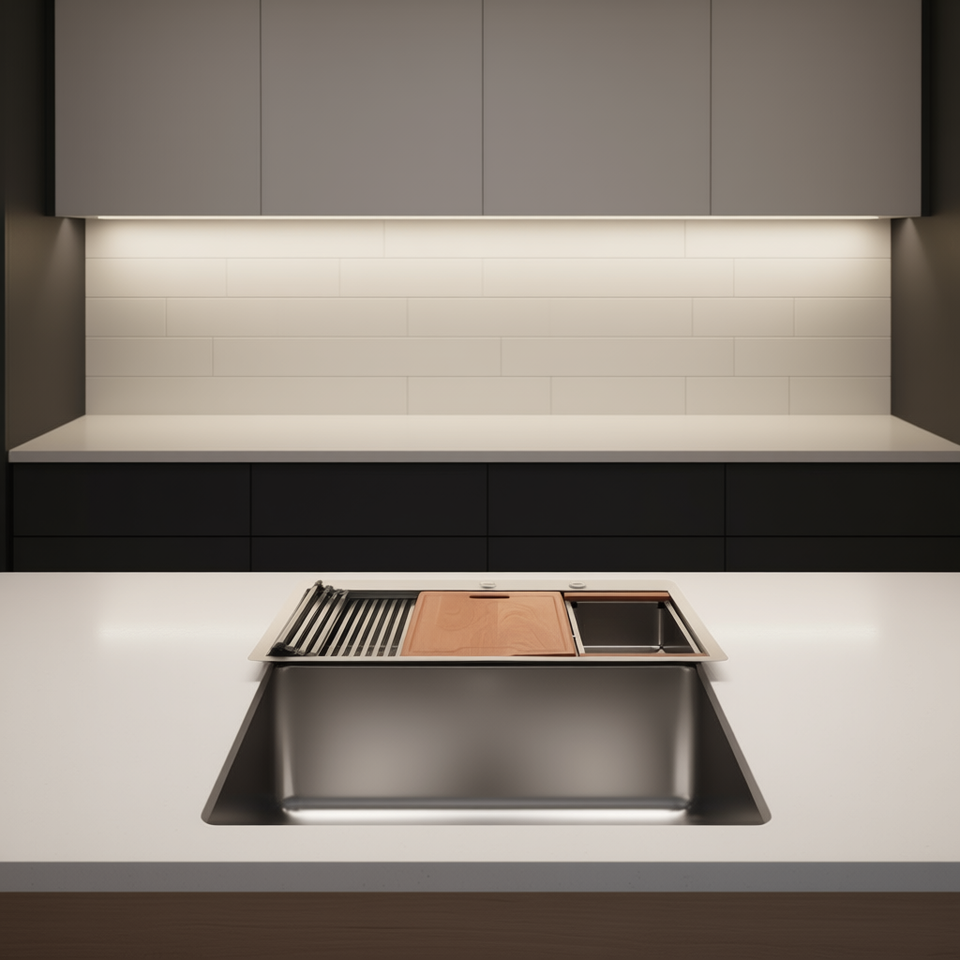 Fregadero de cocina de 30 pulgadas con un solo tazón, de acero inoxidable calibre 16, de montaje superior con estante y área de trabajo.
