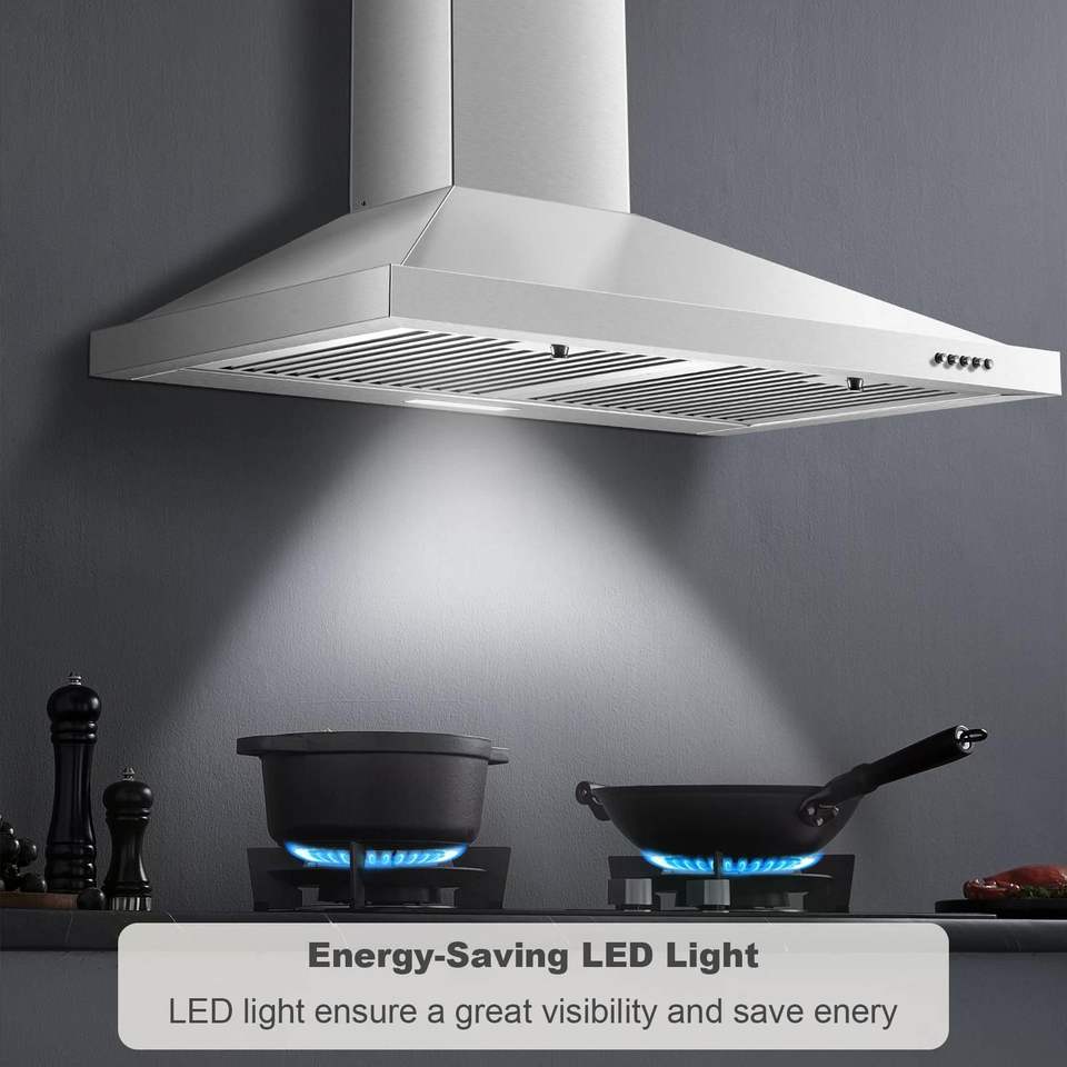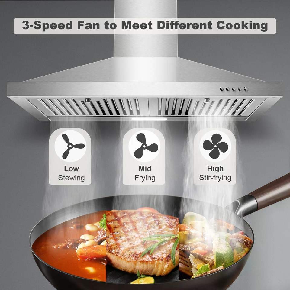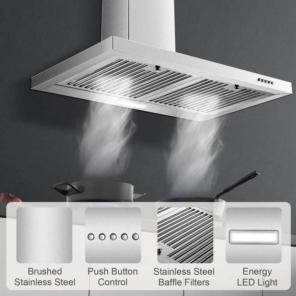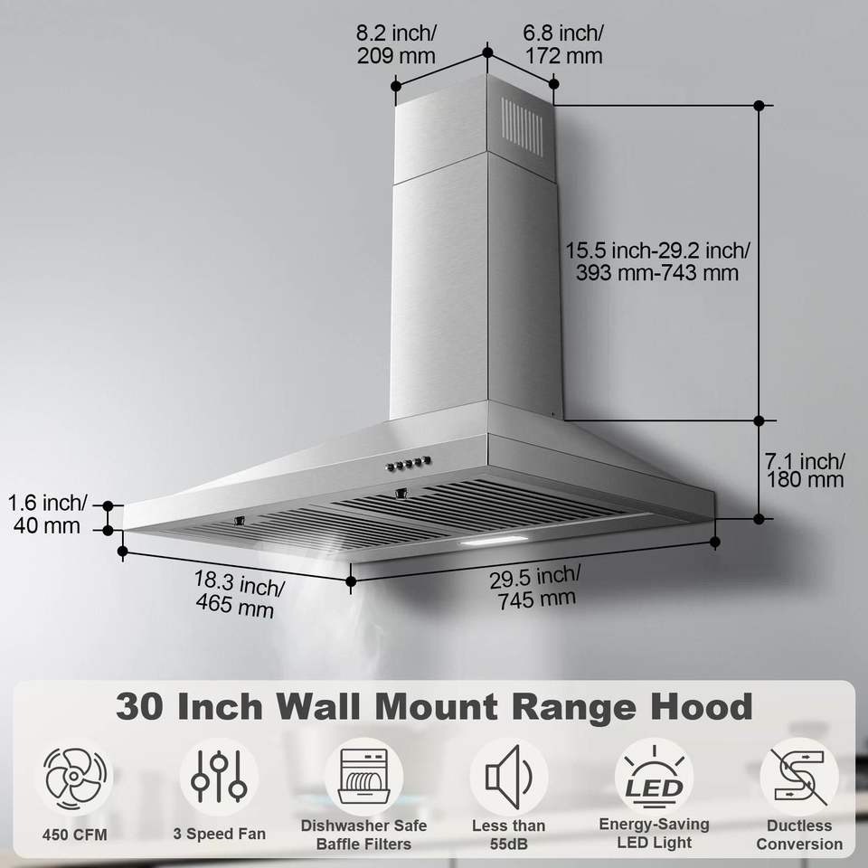 Campana extractora de pared de 30 pulgadas con o sin conducto, con filtros de acero inoxidable y 3 velocidades de ventilación.