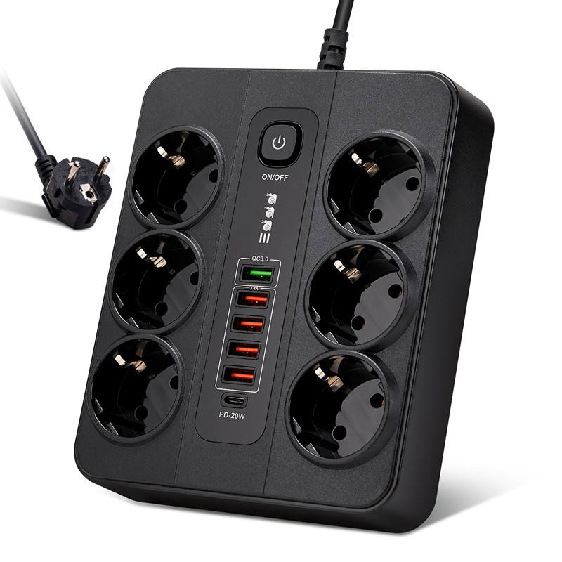 3000W 6 salidas de CA Power Strip 6 estación de carga USB Cable de extensión 2M PD 20W QC3.0 Puerto USB salida rápida de cargador múltiple