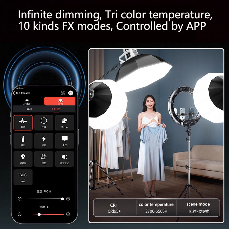 Luz de Relleno LED Bicolor Ajustable de 300W con Control por Aplicación, Alto CRI 95+ para Fotografía Profesional y Transmisión en Vivo de Belleza