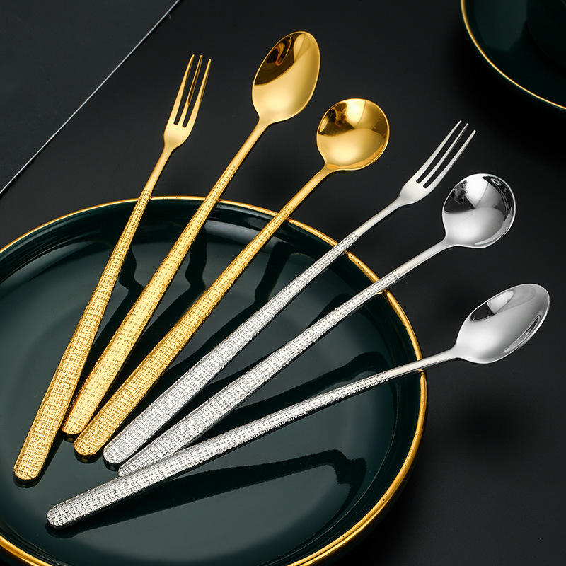 Juego de tenedor y cuchara para hielo de acero inoxidable 304 con patrón de diamante, mango largo, pulido, duradero, para uso doméstico, en bares y en cocinas occidentales.