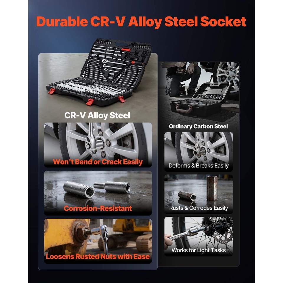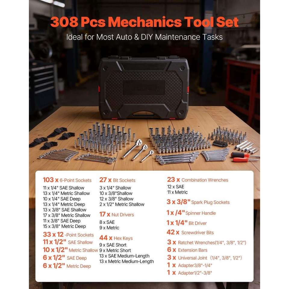 Juego de Herramientas de Reparación de Automóviles de 308 Piezas, Kit de Mecánica con Llaves de Tubo SAE y Métricas de 1/4'', 3/8'' y 1/2'', Destornilladores