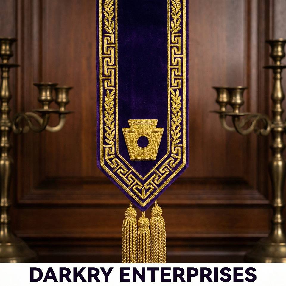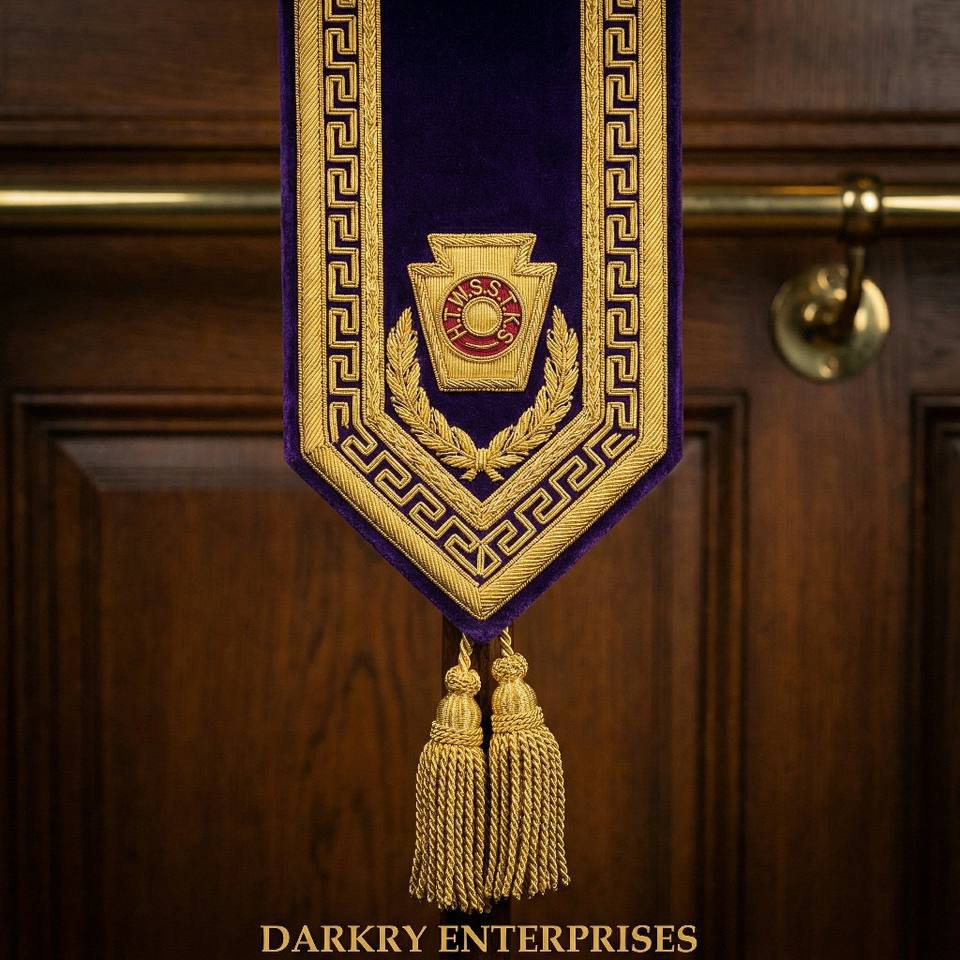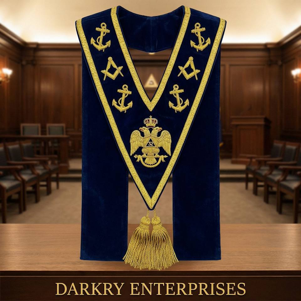 Correa de Rito Escocés de 32 Grados, Bordado con Hilo de Bullion, Corona de Águila Bicéfala de Terciopelo Azul, Insignia Masónica Hecha a Mano con Flecos Dorados