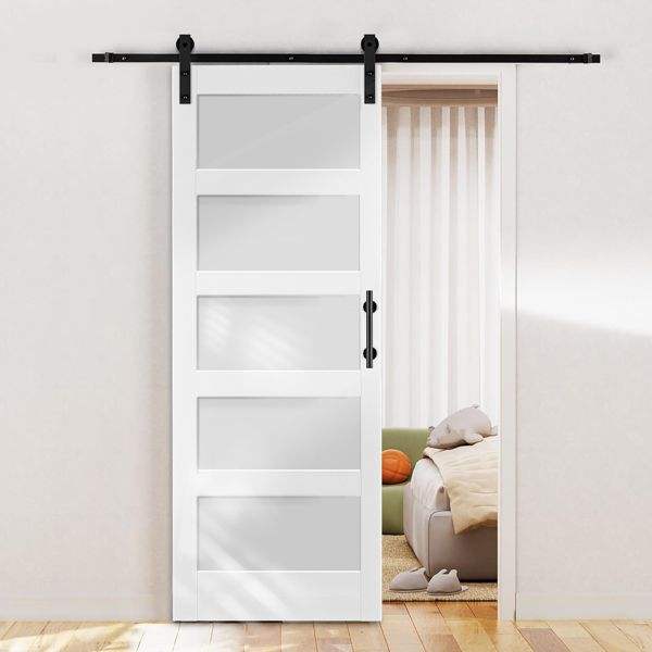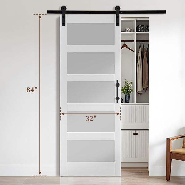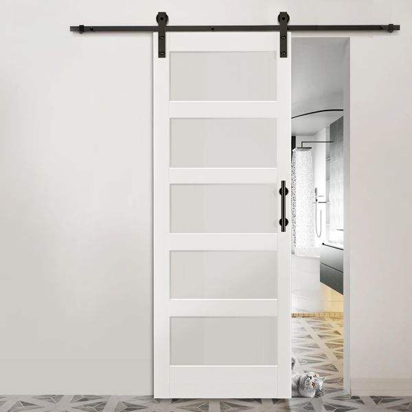 32 Pulgadas X 84 Pulgadas Kit de herrajes para puerta de granero sin terminar de 5.5 pies con manija, 5 paneles de vidrio templado, requiere Simple Simplicity