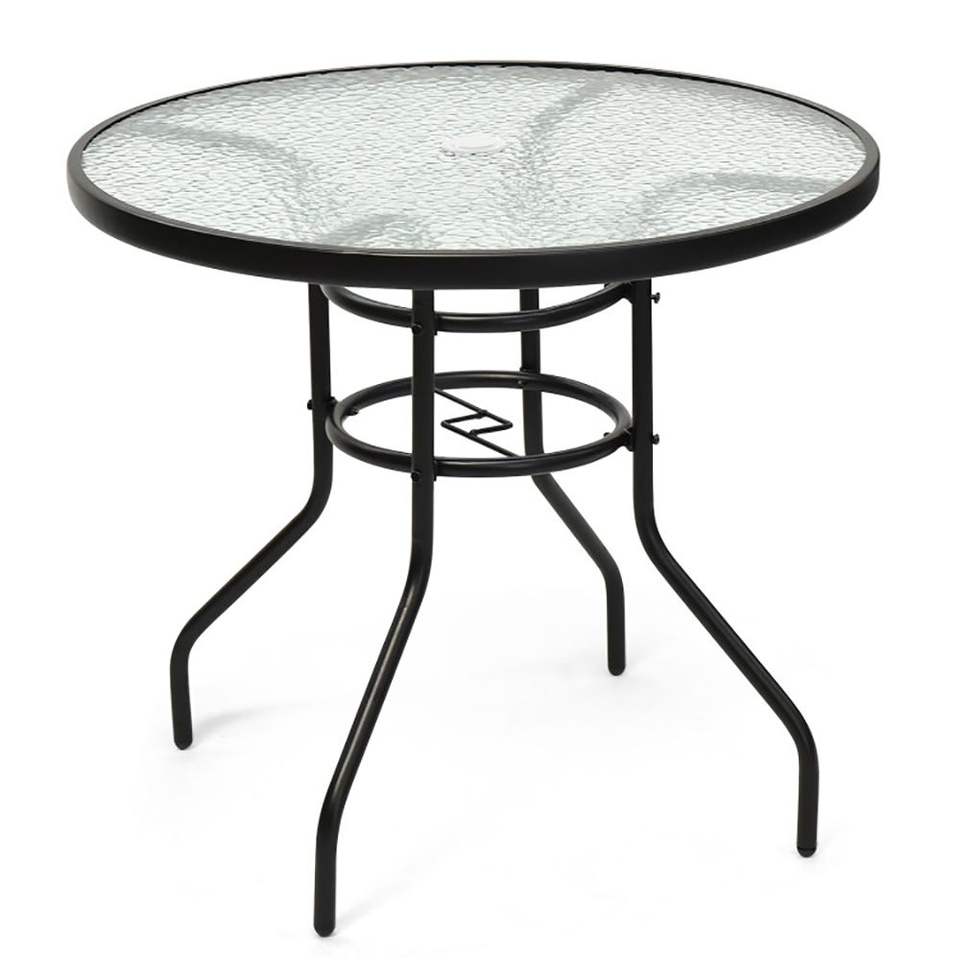 Mesa de Patio Redonda de 32 Pulgadas con Vidrio Templado y Estructura de Acero, con Orificio para Sombrilla, Muebles Elegantes para Exteriores