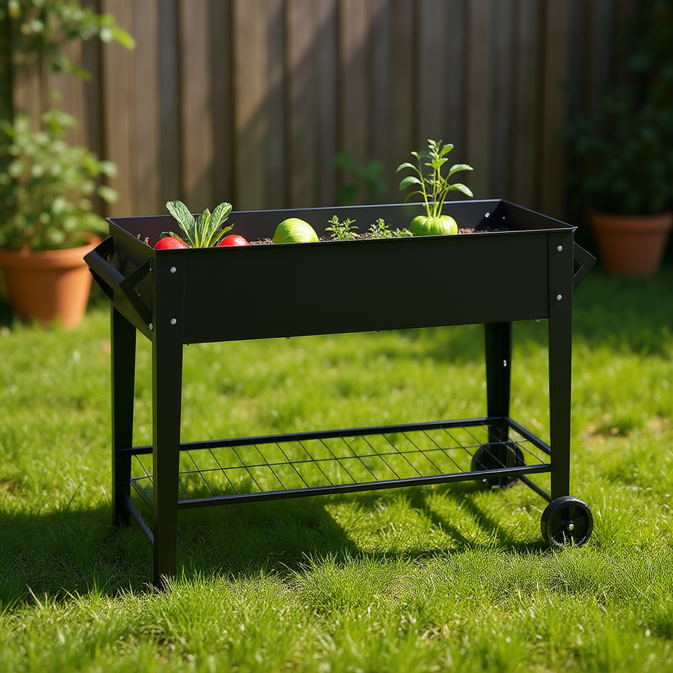 Jardinera Elevada Moderna de Acero de 32 Pulgadas de Alto, Resistente al Óxido, con Ruedas para Cultivo de Vegetales, Hierbas y Flores en Exteriores