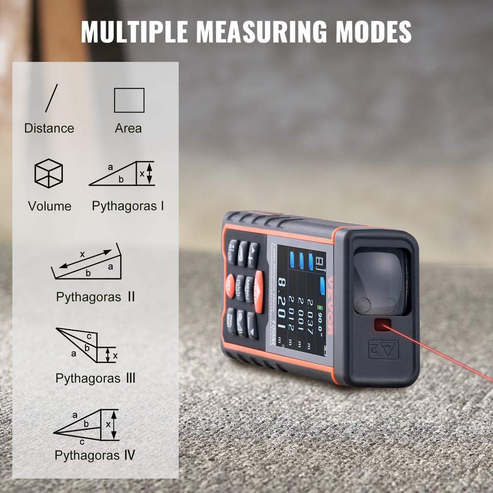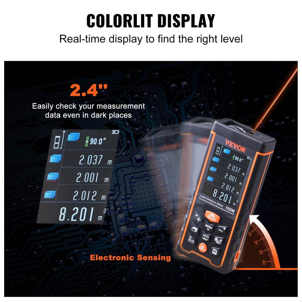 Medidor de Distancia Láser Preciso de 328 pies con Almacenamiento de 100 Grupos, Pantalla LCD a Color de 2.4 Pulgadas, Mide en Pies/m/pulgadas/pulgadas+pies