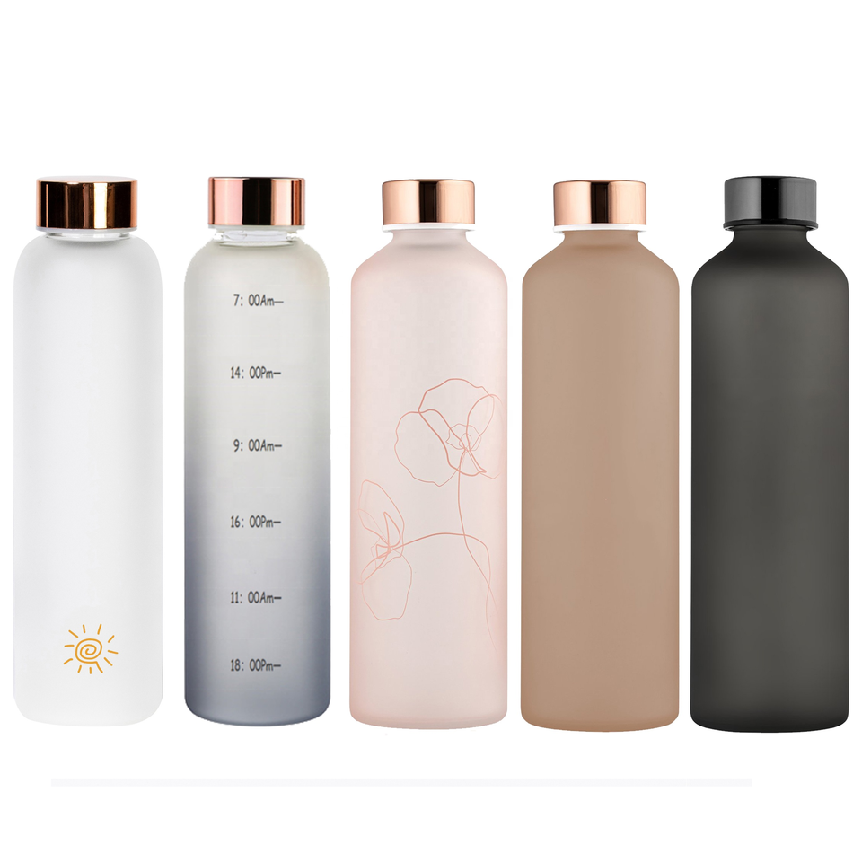 Botella de agua de vidrio esmerilado de borosilicato alto, gradiente colorido, 32OZ, con marcador de tiempo