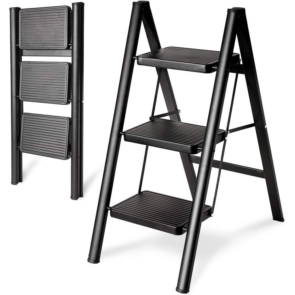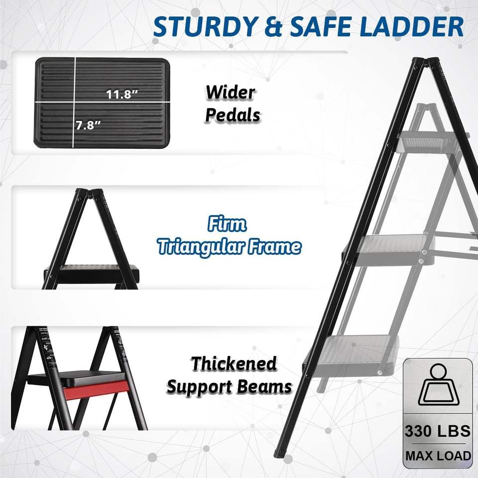Escalera Plegable de Acero de 3 Peldaños, Resistente, con Capacidad de Carga de 330 Libras, para Adultos, Multiusos, para Cocina, Hogar y Oficina