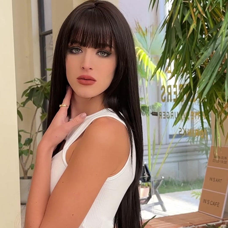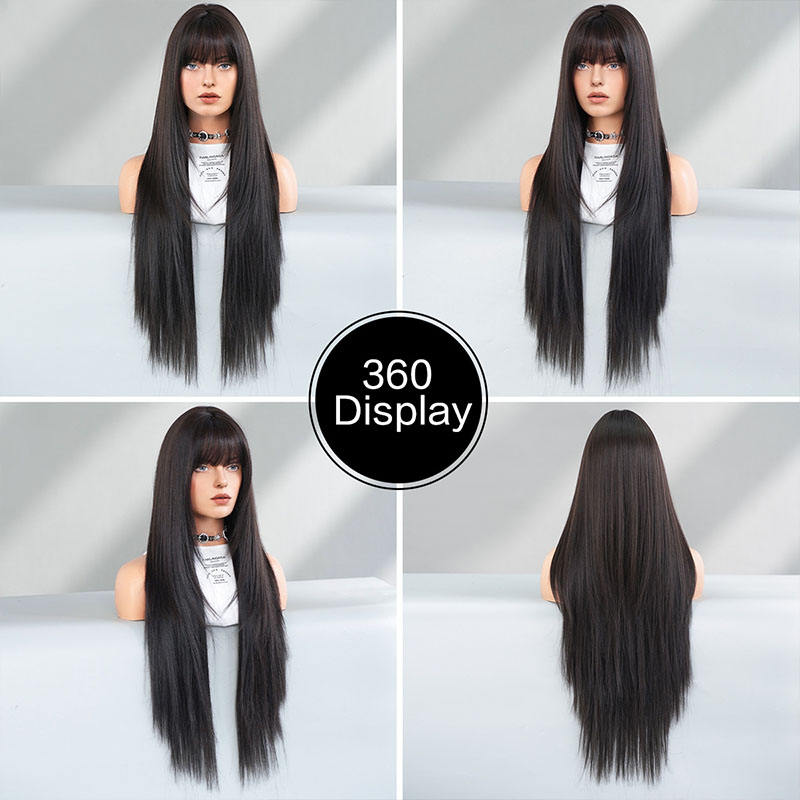 Peluca de Cabello Humano Liso Ultra Largo de 34 Pulgadas con Flequillo y Capas