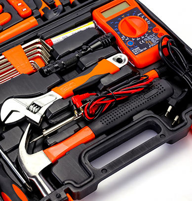 Martillo, Cinta métrica, Lápiz de prueba, Alicates, Cinta de electricista, Destornillador bits 10PCs, Scewdrivers-Conductores, Llave hexagonal 8PCs, 18mm Snap off cuchillo, 18mm Snap off cuchillas, Linterna, Pelacables, Multi-metro, Pluma de la soldadura, Bomba de la soldadura, Soldadura