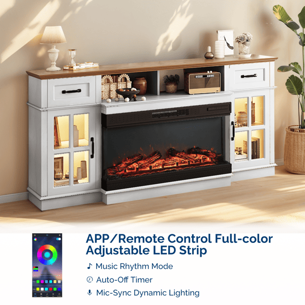 Soporte para TV con Chimenea Integrada de 36 Pulgadas, Parte Superior Marrón y Gabinete Blanco Lavado, 2 Puertas, 2 Cajones, 1 Estante, Luces RGB, Consola Multimedia