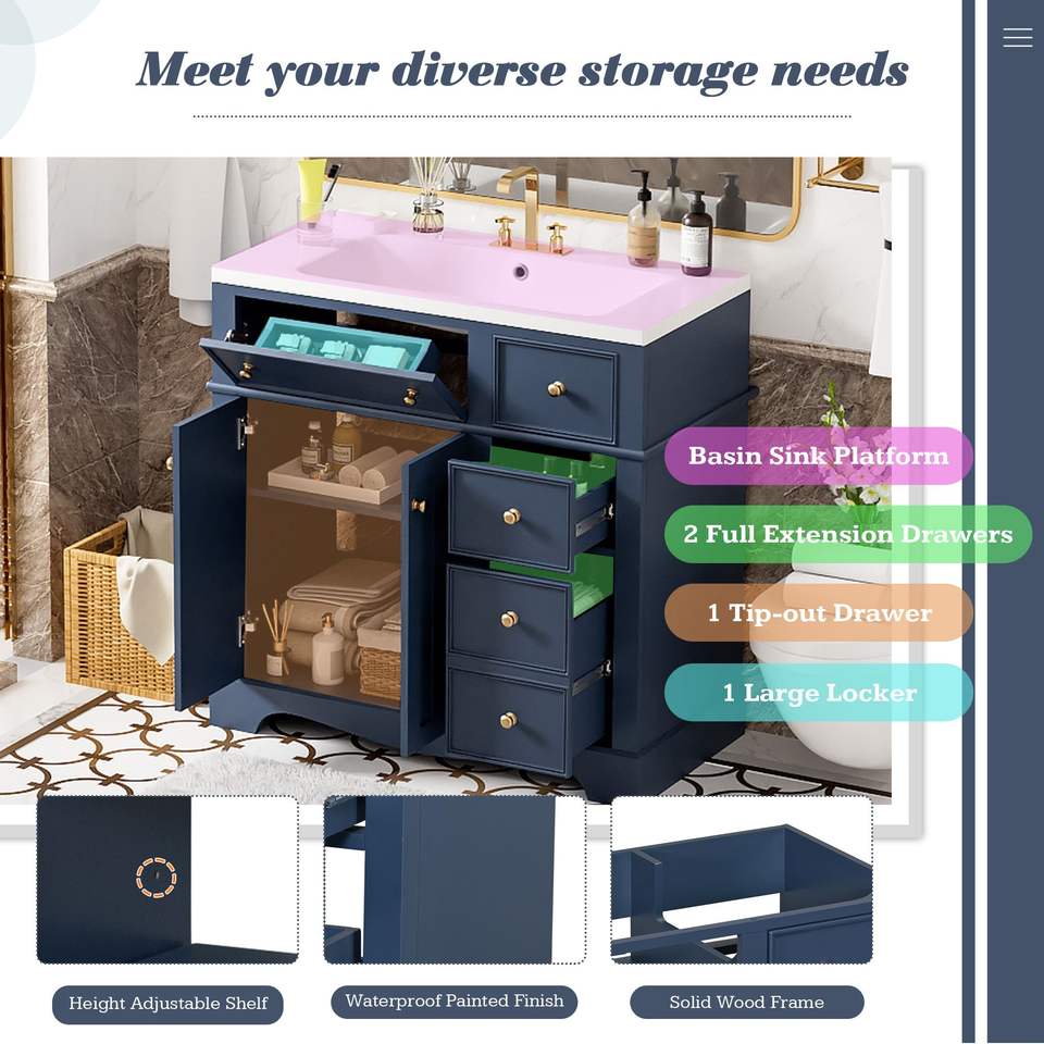 Mueble de Baño Independiente de 36 Pulgadas con 3 Cajones, Estructura de Madera Sólida y Lavabo de Resina, Gabinete de Almacenamiento para Baño