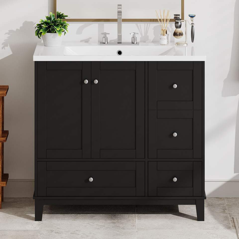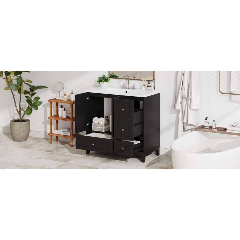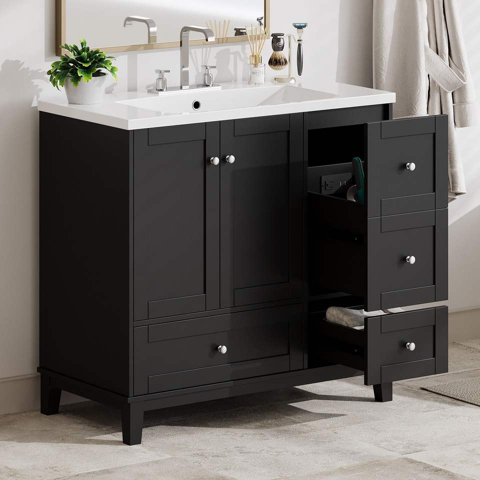 Mueble de Baño Moderno de 36 Pulgadas con Carga USB, Dos Puertas y Tres Cajones, Solución de Almacenamiento para Espacios Pequeños