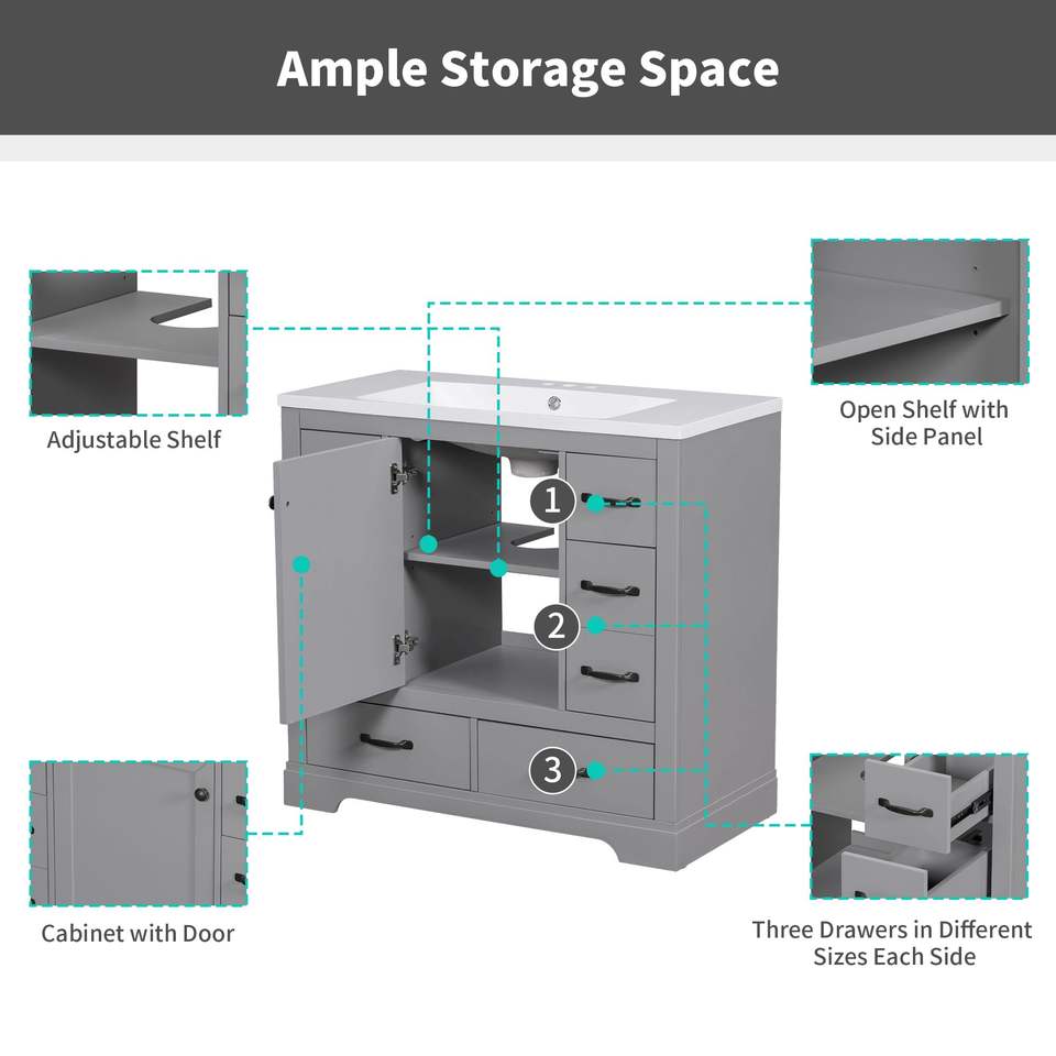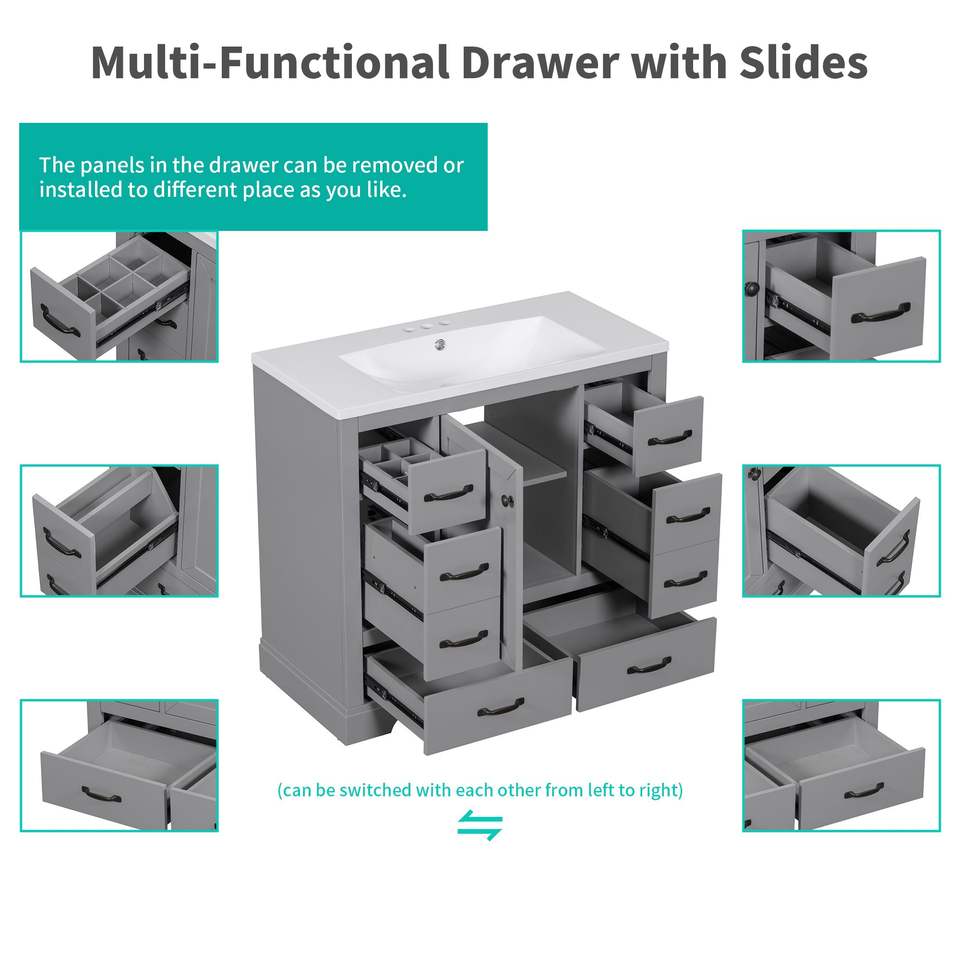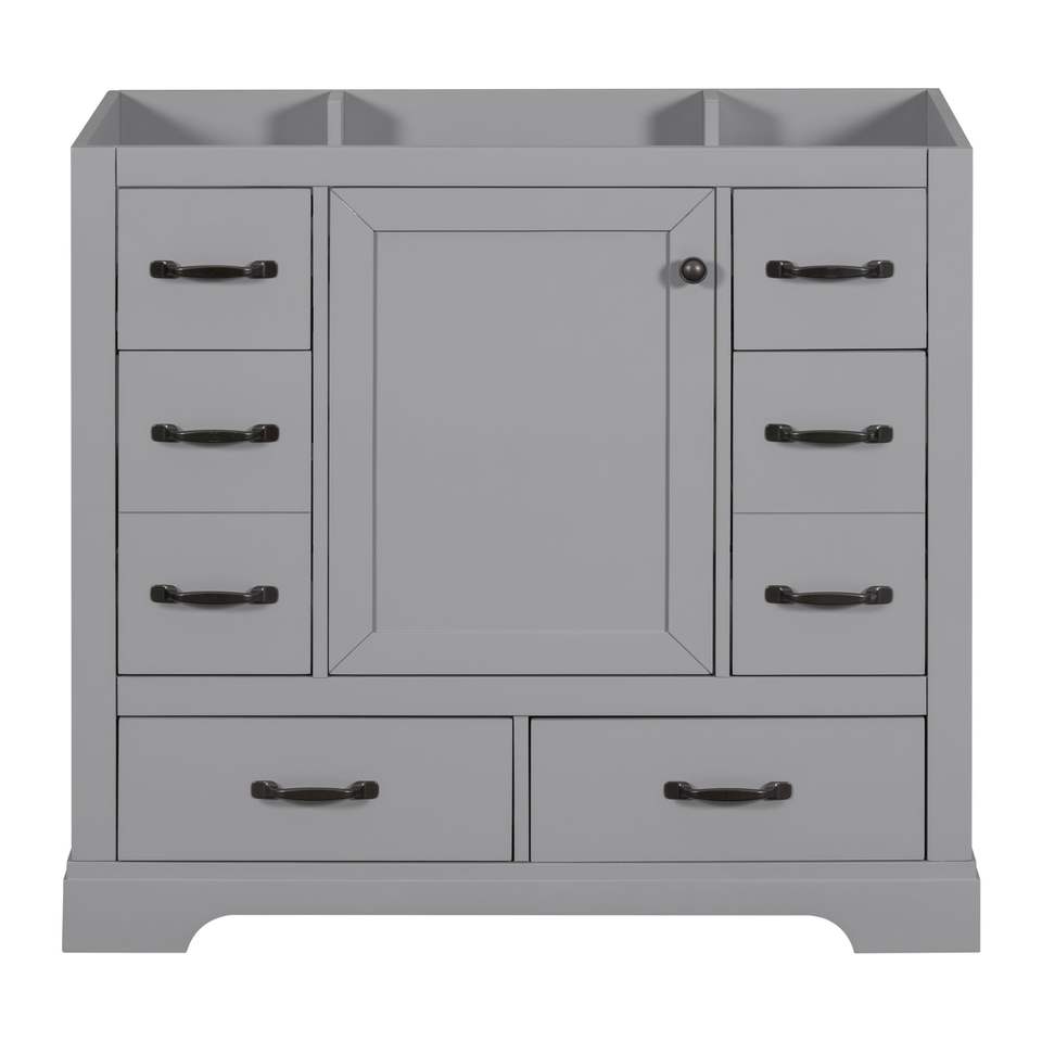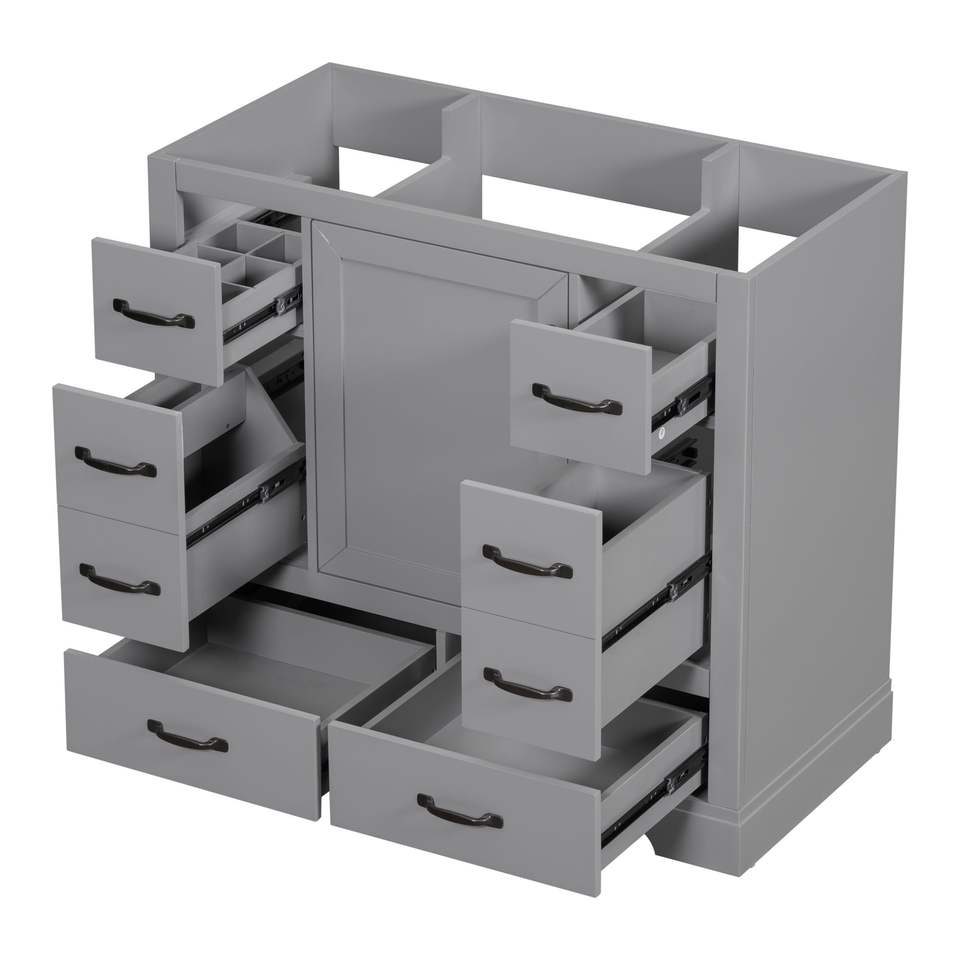 Mueble de Baño Multifuncional de 36 Pulgadas con Lavabo, Seis Cajones y Estante Ajustable, Base de Gabinete Gris (Solo la Base)
