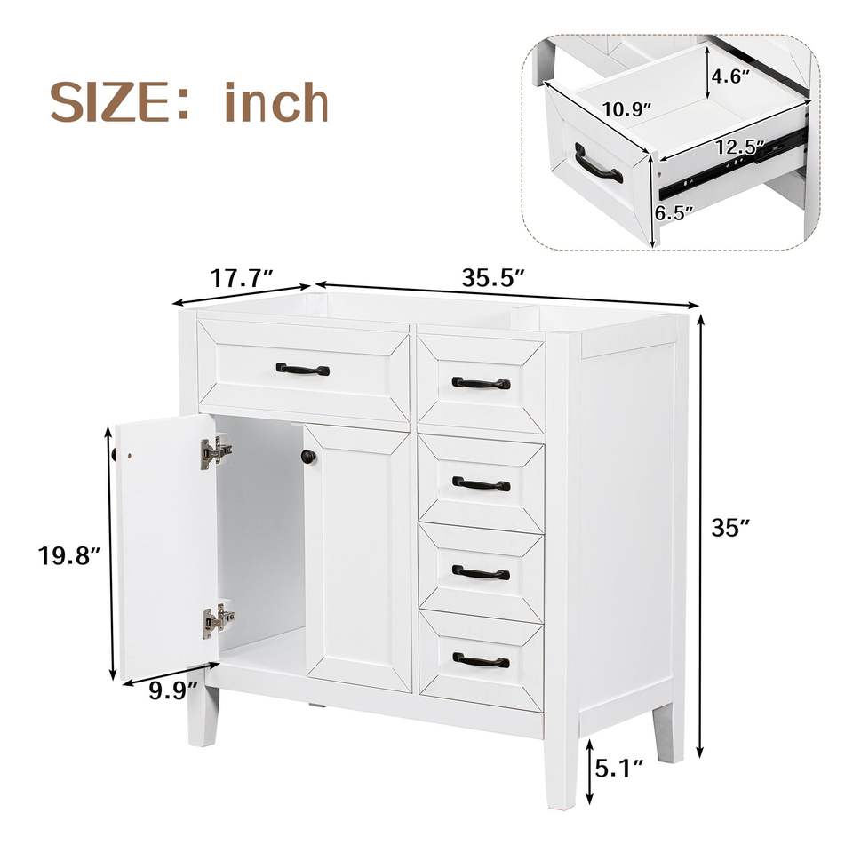 Mueble de Baño con Marco Sólido de 36 Pulgadas, Base de MDF Blanca con Cajones, Sin Lavabo