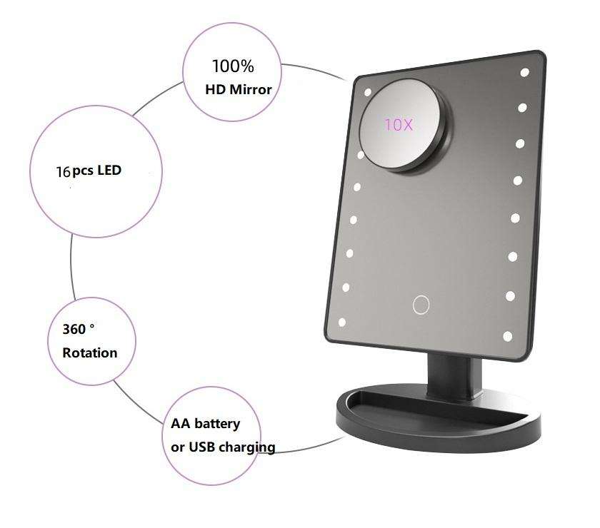 Espejo de Maquillaje con Pantalla Táctil y Rotación de 360 Grados, Plegable, Portátil, Compacto, de Bolsillo, con Luces LED
