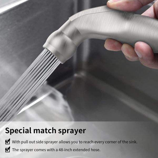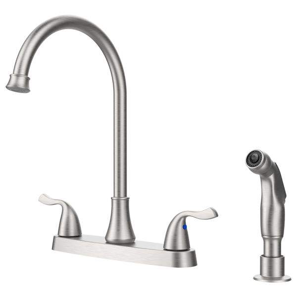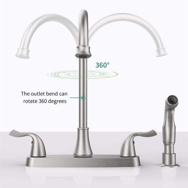 Grifo de Cocina Giratorio de 360° de 8 Pulgadas con Dos Manijas y Rociador Lateral Extraíble, 4 Orificios, Acero Inoxidable 304, Níquel Cepillado