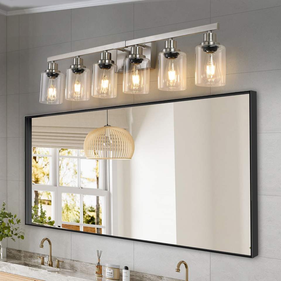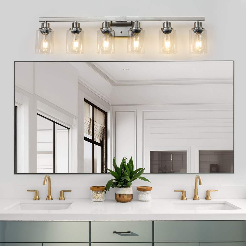 Lámpara de Baño Moderna de 37 Pulgadas con 6 Luces, Acabado Níquel Cepillado y Pantallas de Vidrio Transparente