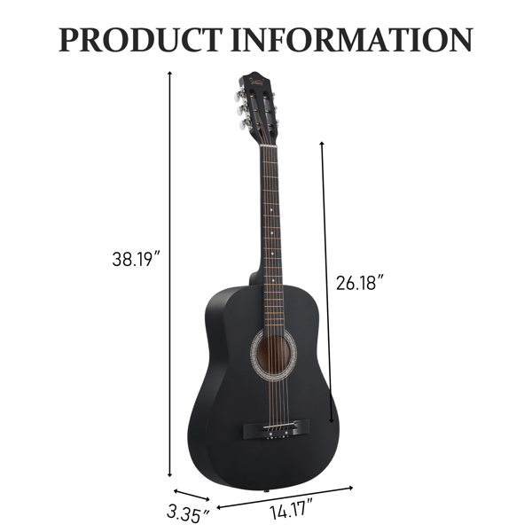 Guitarra Acústica Redonda de 38 Pulgadas con Acabado Negro Mate, Incluye Púas, Cuerdas, Capo, Estuche, Afinador y Correa