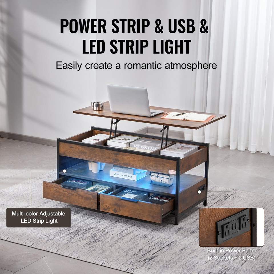 Mesa de Centro Rectangular Elevable de 39.4 Pulgadas con Toma de Corriente, USB y Bolsillos de Almacenamiento Adicionales, Mesa de Centro Plegable