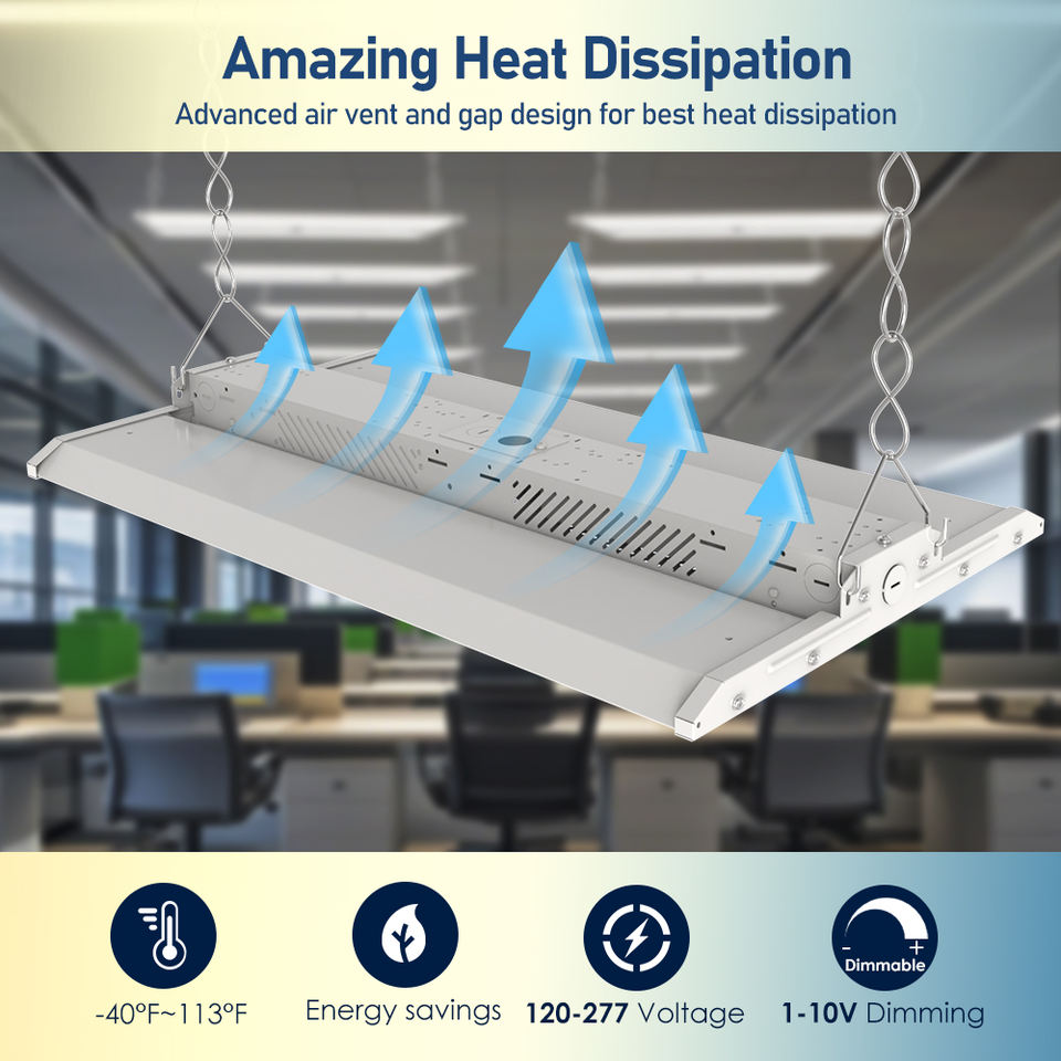 Alta eficiencia luminosa: Con hasta 150 lm/W, esta luz de alto techo proporciona una iluminación eficiente y brillante, reduciendo los costos de energía y mejorando la visibilidad en espacios grandes.