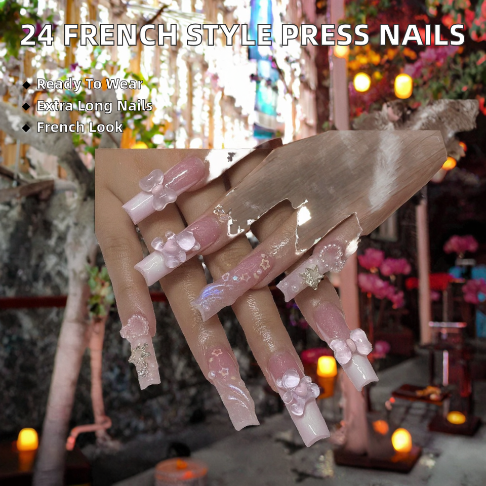 Uñas Postizas Acrílicas 3D Extra Largas, 24 Piezas, Estilo Francés, Románticas, con Pegamento, para Citas y Fiestas