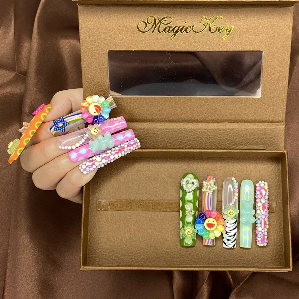 3D colorido girasol 10PCS Gel hecho a mano Uñas artificiales Prensa en diseño único 10PCS Espesor Acrílico Uñas hechas a mano