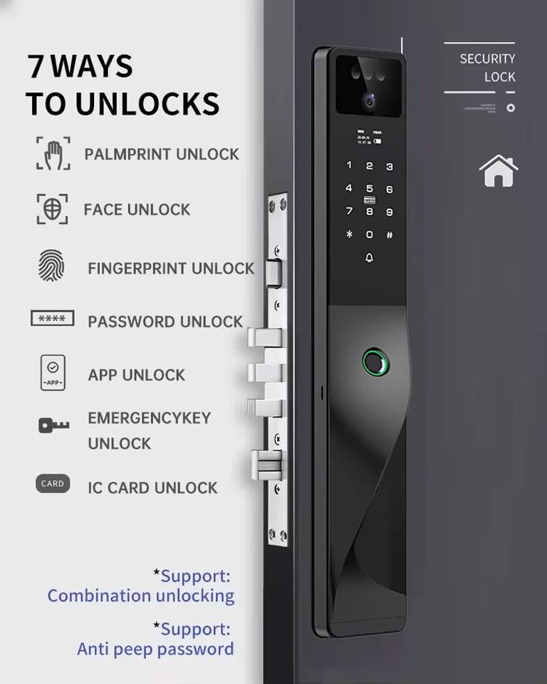 Reconocimiento facial, Control de App, Contraseña, Huella dactilar, Clave, Tarjeta, vena de la palmaDesbloquear (método)