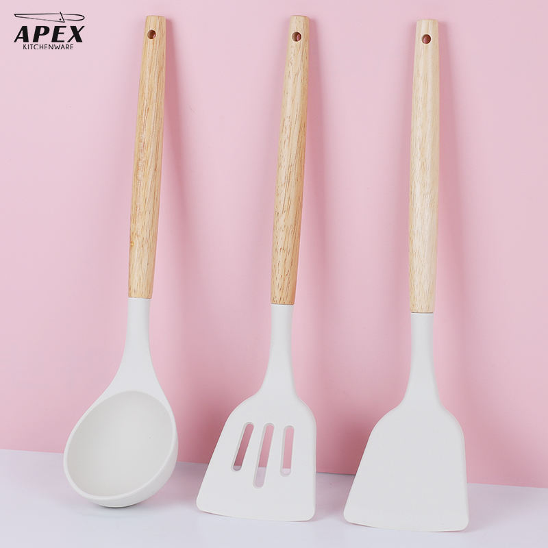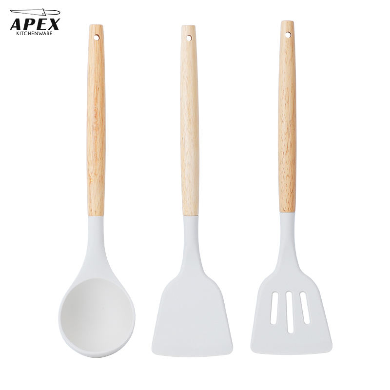 Juego de utensilios de silicona Beige APEX de 3 uds., utensilios de cocina de madera antiadherentes resistentes al calor a altas temperaturas, cucharón para sopa