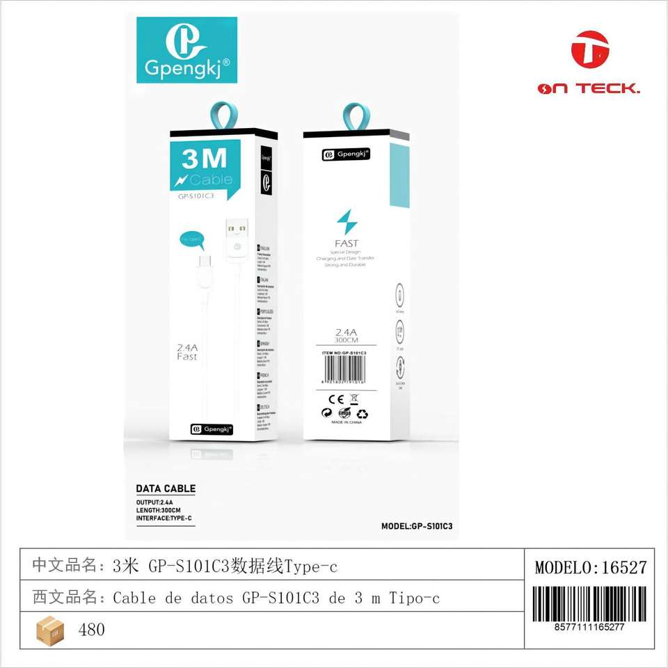 Cable de Datos Gpengkj Tipo C de 3 Metros, Carga Rápida de 2.4A, Accesorio para Teléfono Móvil, Blindado, Cobre Puro, PVC
