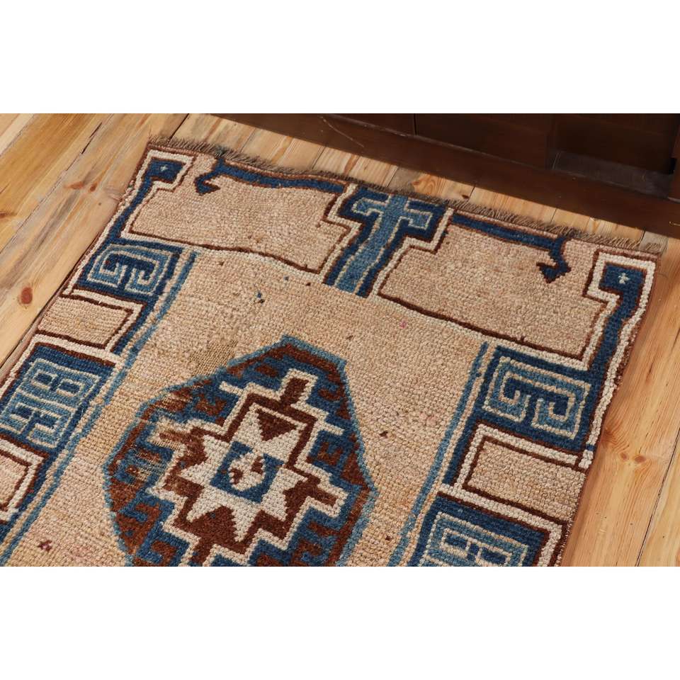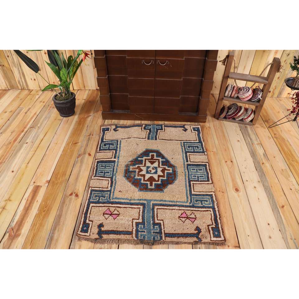 Alfombra Turca Vintage de Lana de 3x3.7 pies, Alfombra Pequeña con Diseño de Plantas y Árboles Azules en Patchwork, Respaldo de Látex Ecológico