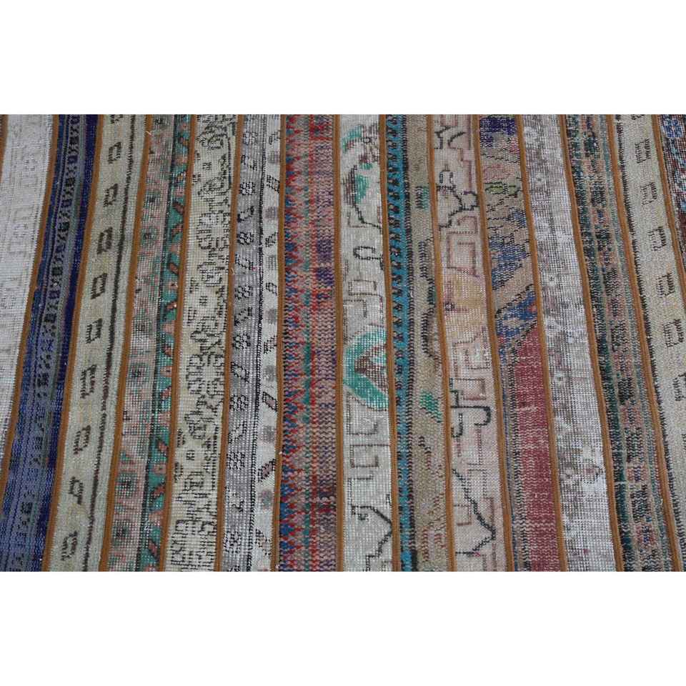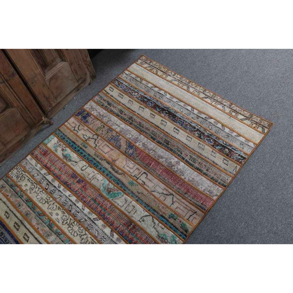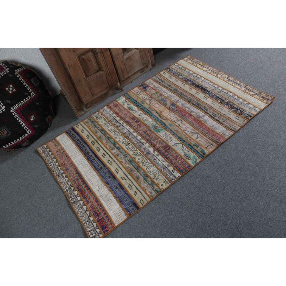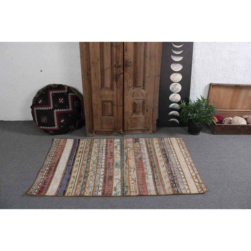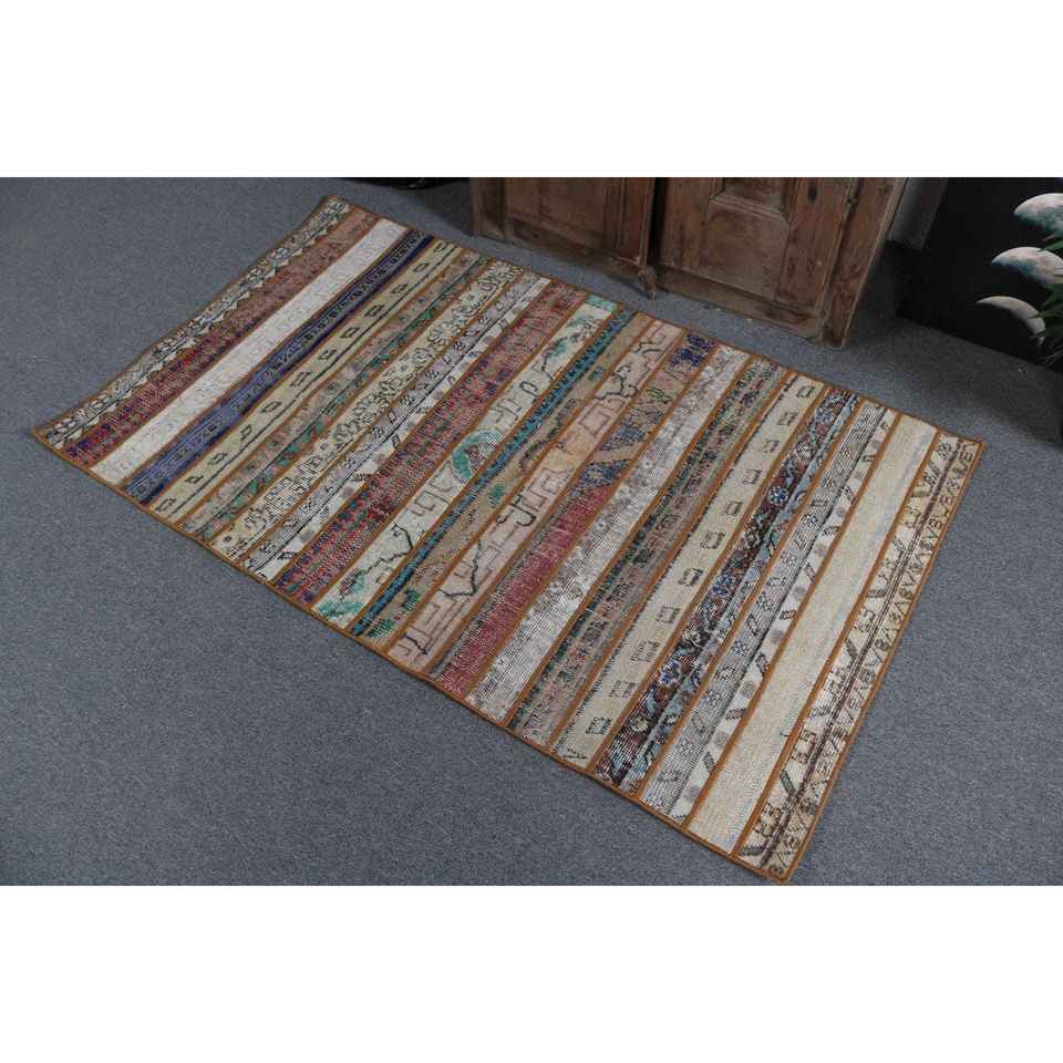 Alfombra Turca de Lana de 3x5.1 pies, Ecológica, Vintage, con Diseño de Parches Azules y Rojos, con Base de Látex