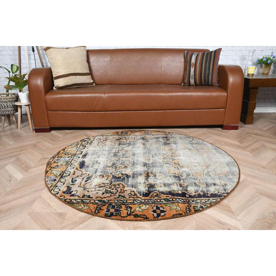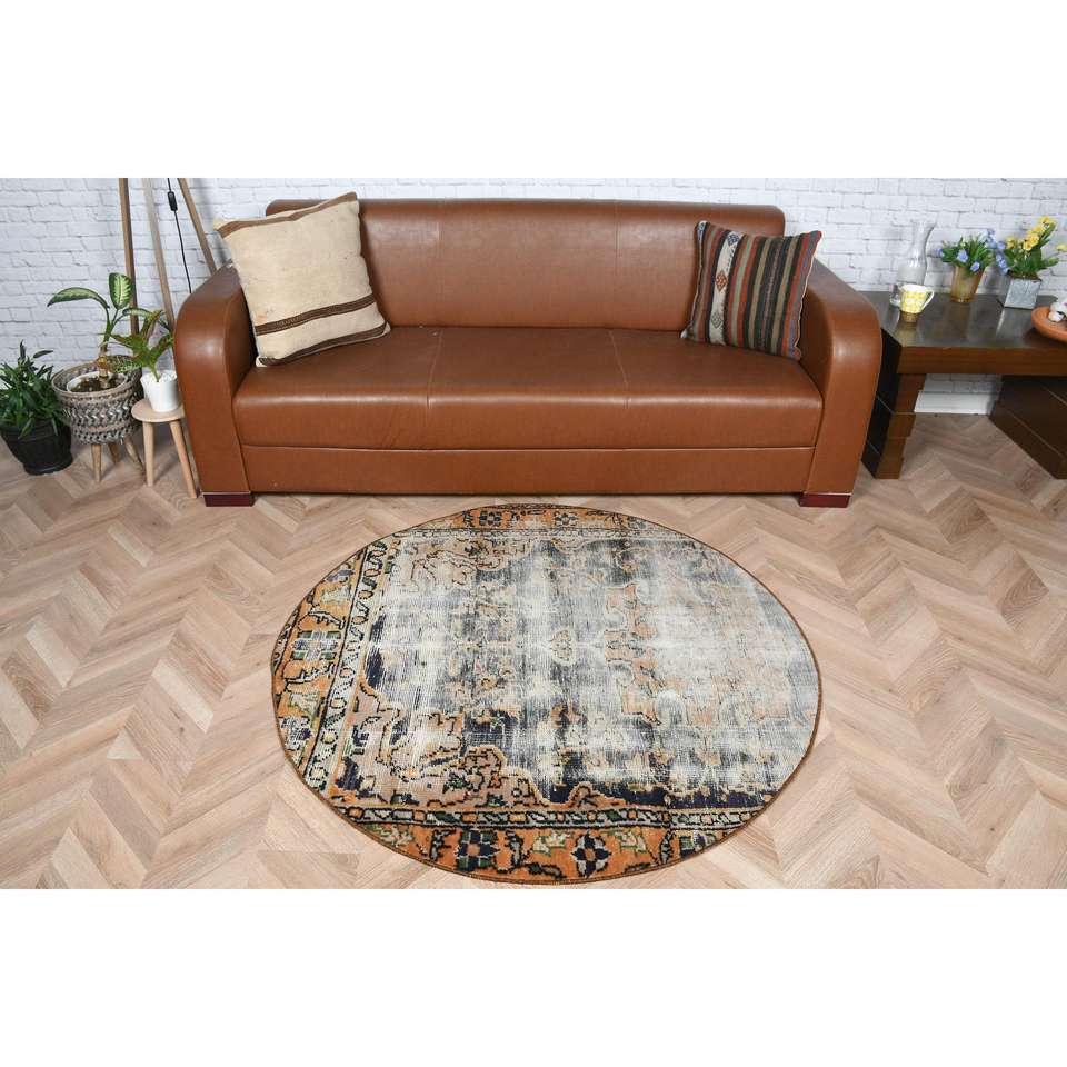 Alfombra vintage de 4.2x4.2 pies, alfombra azul con lunares de lana