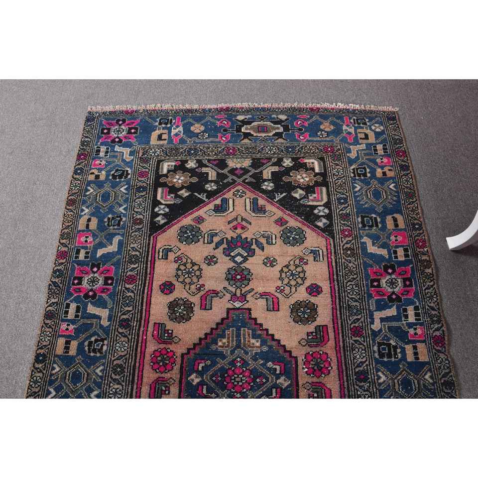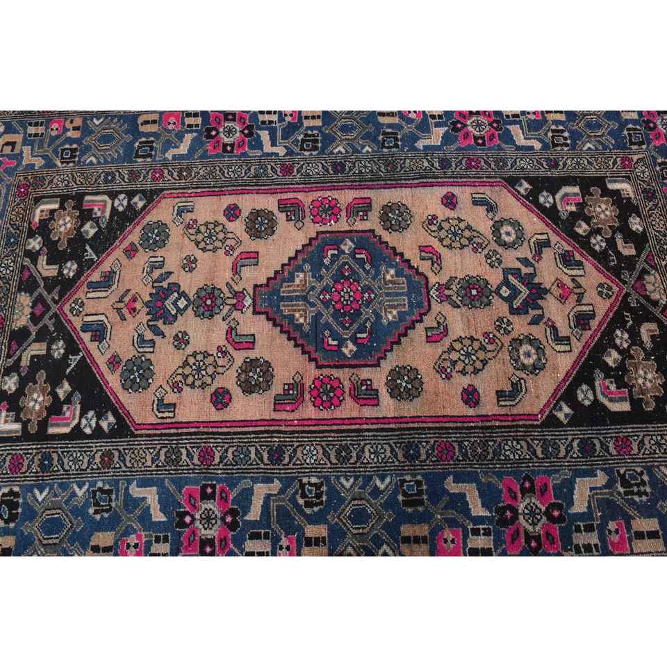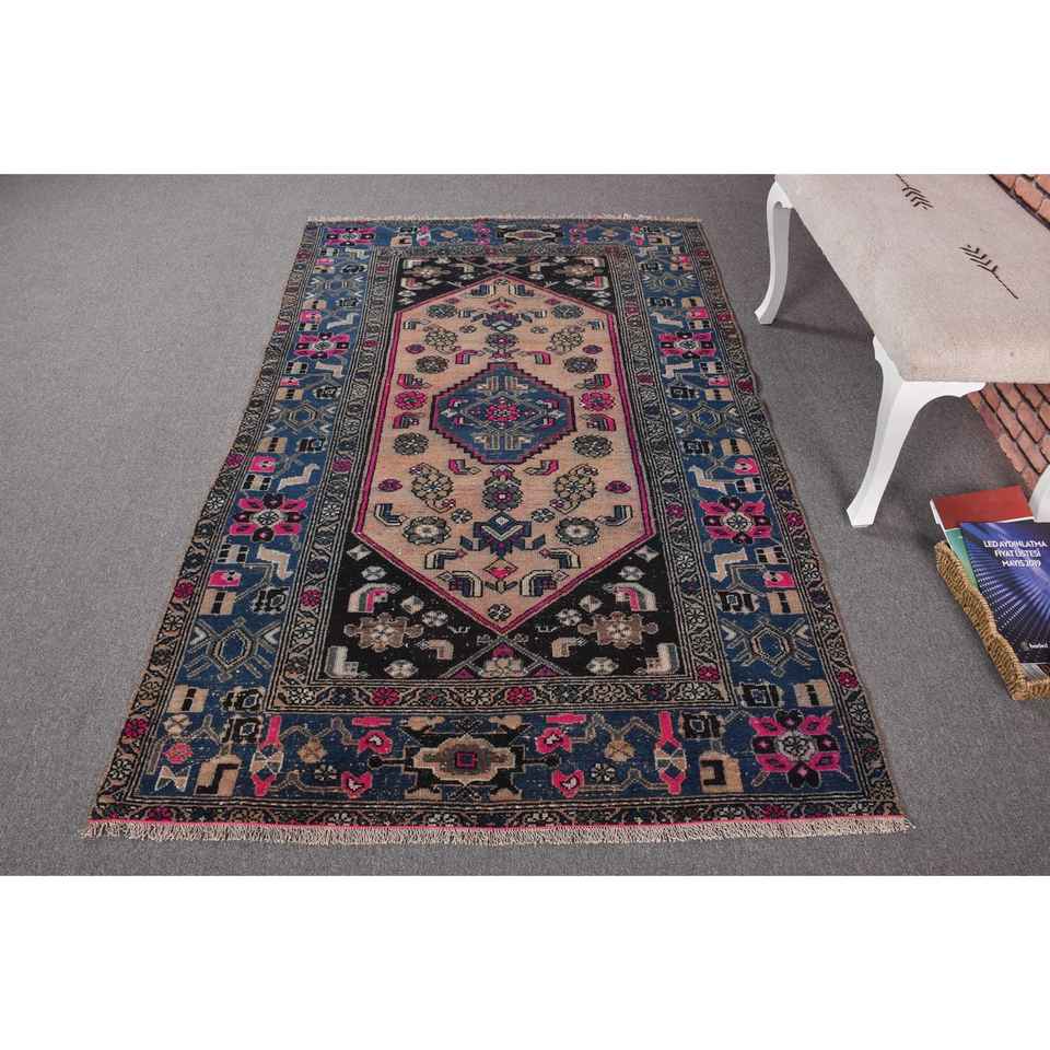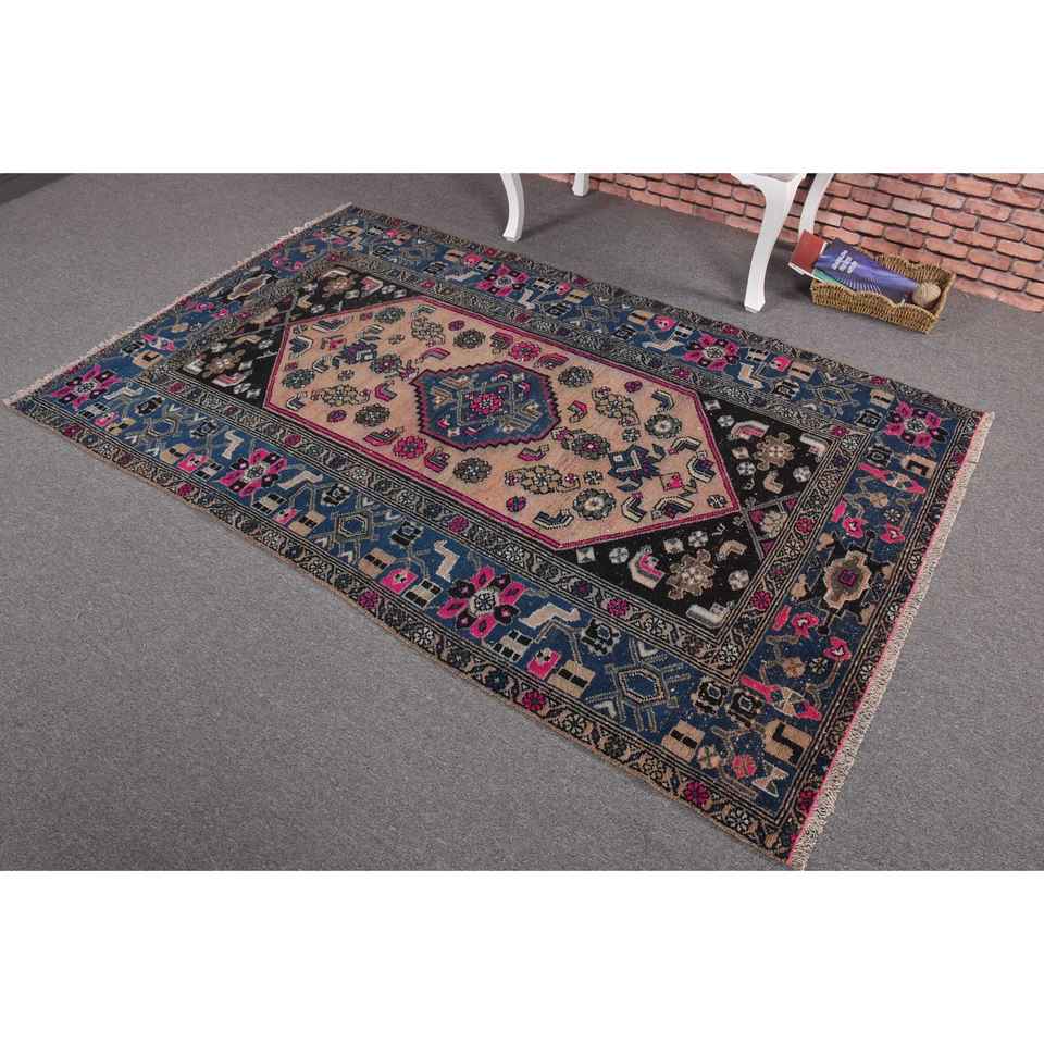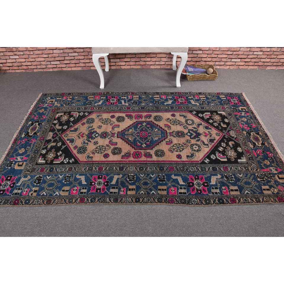 Alfombra Turca de 4.2x6.9 pies, Alfombra Vintage Azul con Diseño Floral de Lana